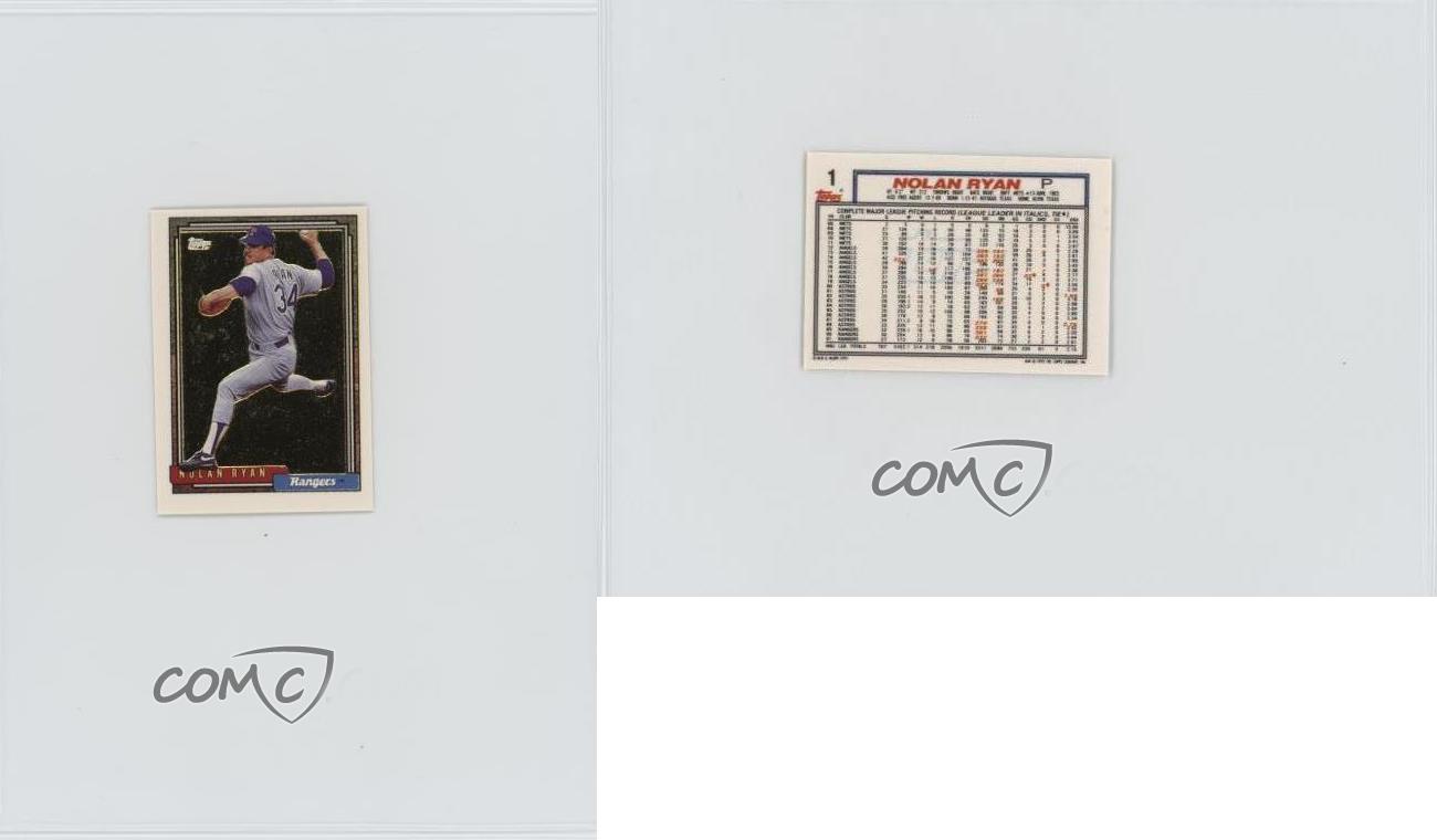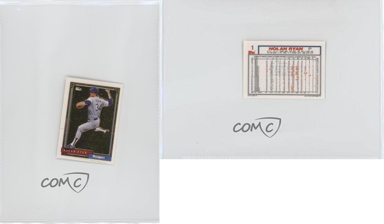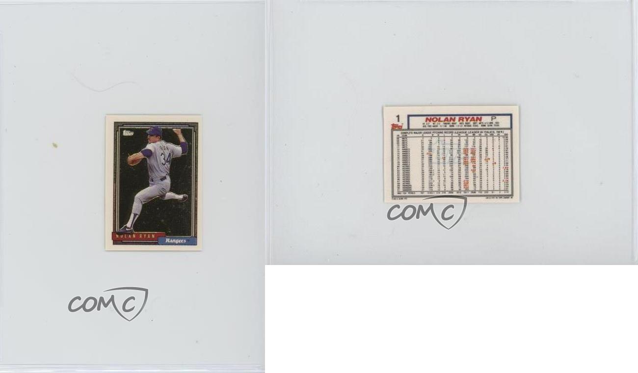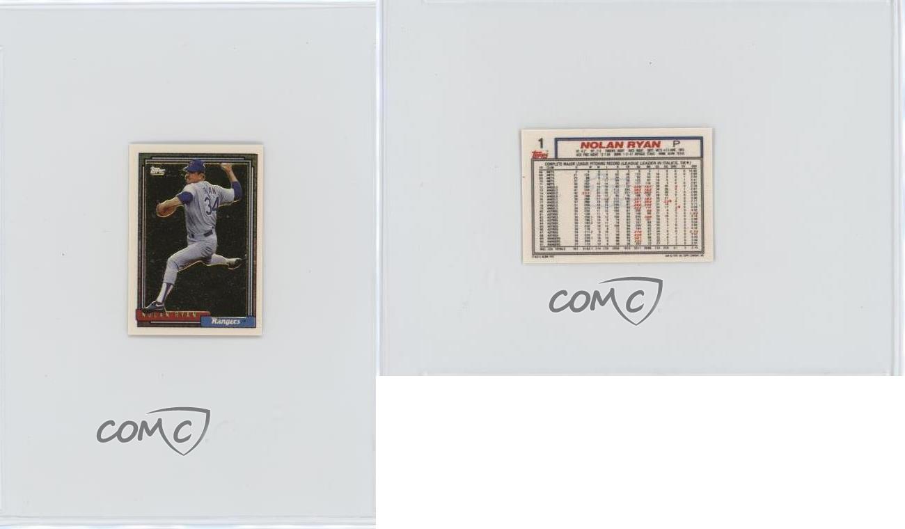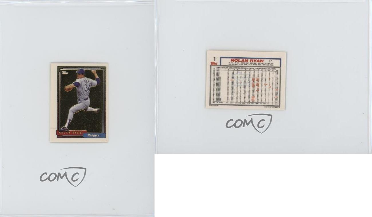 1992 Topps Micro - Box Set [Base] - Gold #1 Nolan Ryan - Baseball Card - Featuring the Texas Rangers - Featuring Nolan Ryan Search for more: 1992 Topps Micro Search for more: 1992 Topps Micro - Box Set [Base] - Gold View all of our Listings Auctions Buy It Now About Us Located in the beautiful Pacific Northwest, COMC (Check Out My Cards) is the world's largest consignment service for trading card singles. More than 10,000 people have used our consignment service to list over 50 million trading cards. Find out how we can help you consign your items on eBay by contacting us through eBay messaging. COMC -- "The Safe & Easy Way to Buy & Sell" Representative Image - Select Specific Item above to see image of actual item Representative Image - Select Specific Item above to see image of actual item Raw Condition for Modern Cards Unless otherwise noted, raw modern cards are listed in Near Mint-Mint condition or better. A NM-MT card appears to be Mint at first glance, but upon closer inspection, may exhibit some of the following: minor print defects (e.g. roller marks, print line, dimple), minor scratches, slight edge wear, and slight corner wear. Centering is clearly visible in the images provided and does not factor into our condition assessment. Raw Condition for Vintage Cards Unless otherwise noted, raw vintage cards are listed in Excellent condition or better. An EX card may exhibit some of the following: minor rounding of corners, surface wear, print defects, light scratches, and slight edge wear/chipping. Centering is clearly visible in the images provided and does not factor into our condition assessment. Domestic Shipping Combined shipping for multiple items is available. To receive combined shipping, please ensure all desired items are in your eBay shopping cart before proceeding to checkout. eBay limits orders to 40 items per order. We automatically combine multiple orders placed on the same day. If you place multiple orders on the same day, please contact us to request a refund of applicable shipping costs. Signature confirmation may be required on invoices over $400. All cards are protected and shipped securely. International Shipping COMC offers eBay's International Shipping (EIS) for international orders under $2,500* (see country exceptions below). All duties and import fees are paid at checkout; in the rare event that there are additional import fees upon delivery, these are borne by the buyer. EIS packages route through a shipping hub in Erlanger, KY before shipping to their final destination. Please note that EIS does not allow for combined shipments. The shipping rates are determined by eBay and cannot be adjusted. *Maximum sale price exceptions: Colombia, Kuwait ($2,000); Taiwan ($1,539); Chile, Costa Rica, Guatemala, Honduras, Trinidad and Tobago ($1,000); Antigua and Barbuda, Aruba, Belize, Dominica, Grenada, Philippines, Saint Kitts and Nevis, Saint Lucia, Montserrat, Turks and Caicos Islands ($500); Dominican Republic, El Salvador ($200). Please request a shipping quote through eBay messaging for orders that exceed the maximum sale price supported by eBay's International Shipping. You will be responsible for all duties and import fees for international orders shipped outside the EIS. All cards are protected and shipped securely. Payment COMC does not accept offers on our cards through our eBay storefront. COMC utilizes eBay’s managed payments system. If you are experiencing difficulties making a payment, please contact eBay for assistance. Return Policy Returns are only accepted on the rare occasion the item is not as described. If you are making a return, please initiate the return process through eBay so a mailing label can be provided for you. Prior to listing, our expert team carefully assessed this item to represent it accurately. Please review the description and high-definition images prior to purchasing to ensure this item meets your satisfaction. We welcome you to contact us if you have further questions about this item. Trust and Integrity COMC carefully assesses each item consigned to us to prevent fraudulent items from entering the marketplace. If you believe an item offered on COMC may be fraudulent, please contact us with details so we can investigate the issue. Items we determine are outside our supported items policy may be removed. Last Modified: 5/31/2025 7:40:47 AM PDT