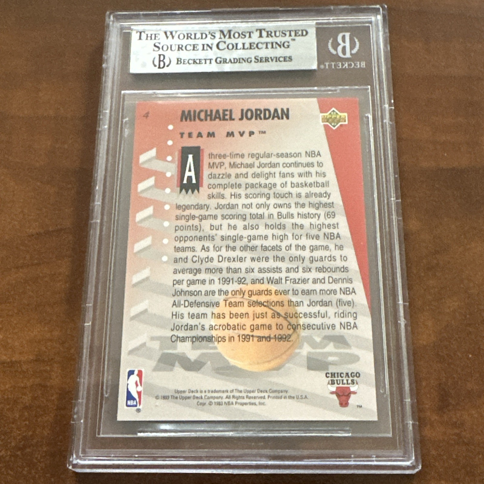 The product is a 1992 Upper Deck MVP Holograms #4 Michael Jordan sports trading card graded by Beckett Grading Services as a 9. This holographic card features the legendary basketball player, Michael Jordan, from the National Basketball Association (NBA). It is a highly collectible item for basketball fans and card collectors alike, showcasing the iconic player in his prime during the 1992 season.