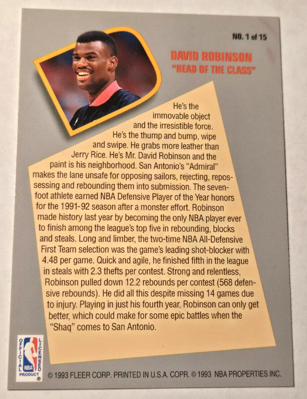 1992-93 Fleer Total D David Robinson #1 NM Condition noted Shipping via USPS (eBay Standard Envelope) *Shipping discount available when buying multiple cards at once. Applied after check out.* · Grading Guide 1. Mint - Flawless Pack fresh card 2. N/M (Near Mint)- A perfect or near perfect card. May have very slight edge or corner wear noticeable only on close inspection. 3. Ex (Excellent) - Shows light wear from play. May have a few edge nicks or a lightly worn corner. No bends, creases, or marring. 4. VG (Very Good) - A card with moderate wear from play. May have multiple edge nicks and whitening along the edges. 5. G (Good) - Moderate to heavy wear from play. All edges show whitening and surface probably shows wear. This may also be a card with a single bend or light crease that would otherwise be NM. 6. Fair/Poor - Shows Considerable Wear. All edge and surface show whitening. May have a major bend or Crease