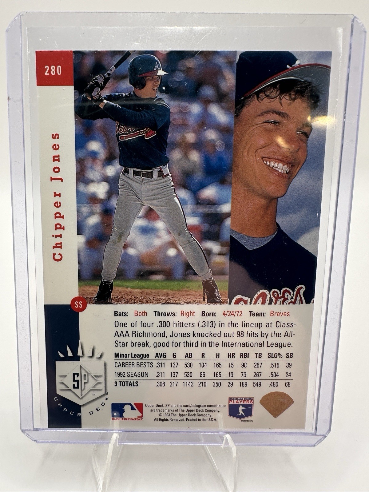 Six-card Chipper Jones rookie/prospect lot highlighted by the 1993 Upper Deck SP rookie. Includes: 1993 Upper Deck SP #280 1993 Donruss Rated Rookie #721 1993 Topps Stadium Club #638 1992 Topps Gold Winner Prospects #551 1991 Upper Deck Top Prospect #55 1991 Score #671 Cards are all from set breaks and appear to be in near mint condition. Great budget Chipper rookie lot. Will ship in 3 top loaders- 2 cards in each to stay below thickness threshold for eBay standard envelope and provide lowest cost shipping to buyer.