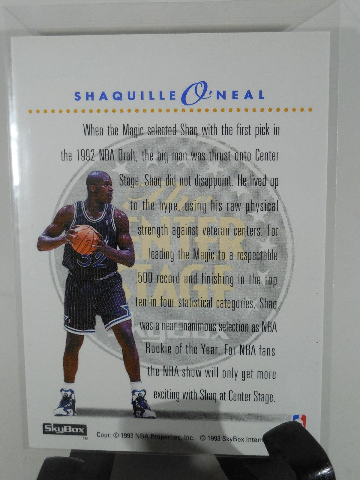 Elevate your collection with the 1993 SkyBox Premium center stage Shaquille card. Capturing the essence of the Orlando Magic's powerhouse, this card is a cherished piece of basketball history from the '93 season. Crafted in the United States with quality card stock, it's a testament to the durability and artistry of the era.This original piece is not autographed, preserving the authenticity of its vintage appeal. It's presented in English and features the standard card size, making it a seamless addition to any NBA collection. The card is a true representation of the SkyBox manufacturer's dedication to capturing the spirit of the sport during the early '90s.