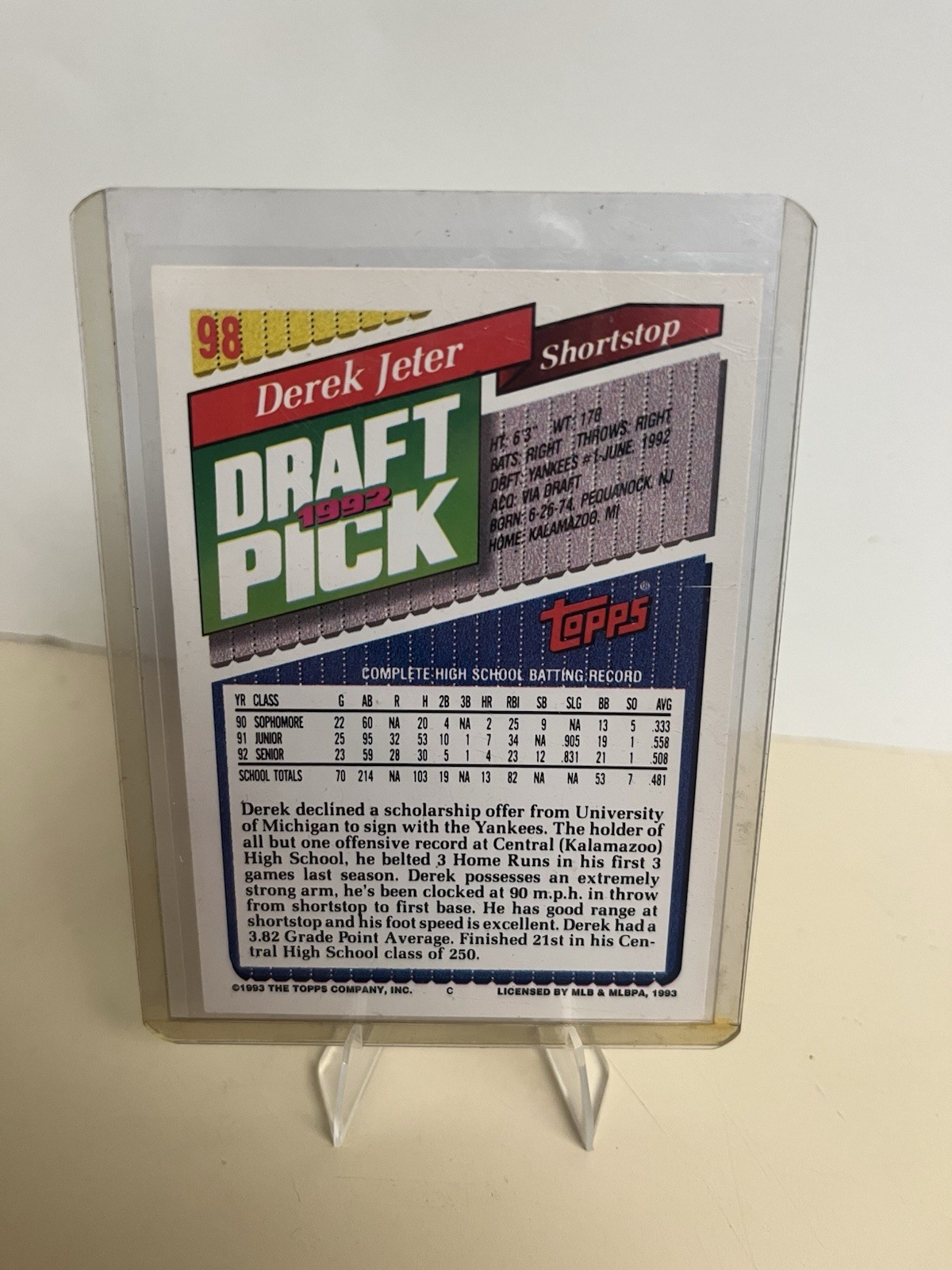 The 1993 Topps Derek Jeter #98 rookie card is a highly sought-after collectible in the sports trading card market. This baseball card features the iconic Major League Baseball player in his early years with the New York Yankees. As part of the 1993 Topps set, this card is a valuable piece of memorabilia for fans and collectors alike. With its near mint condition, this card is a must-have for any baseball card enthusiast looking to add a piece of sports history to their collection.