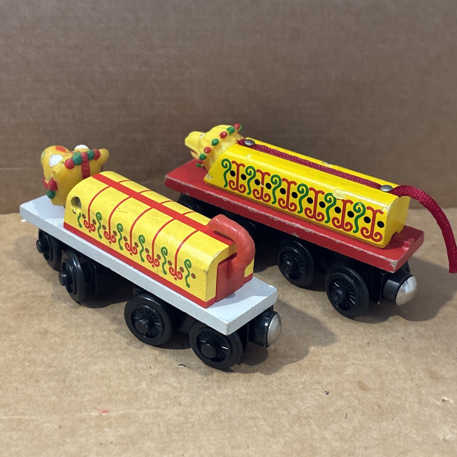 LOOK!!! 1994 1st Edition & 2003 Chinese Dragon - Thomas & Friends Wooden Railway Train Car Tank Engine - see photos - the 1994 has what I will describe as a repeatable if not crude solution to a common problem on these older trains. It’s got a little bit of packing tape over a cracked spot on the bottom of the truck, so the wheel doesn’t fall out, and I think you could do it again when it finally tears. Not sure it’ll happen twice in a row - it *mostly* sits in there. The 2003 version has that strange head that goes up and down, but just have to do it yourself. And the plastic tail, instead of that rope or whatever the other one is considered. The face is OK, not great Anyway, shout out to the restaurant near my house, Twin Dragon. It looks run down in the photos, but I’ve only ever had delivery. Works for me. Ships usps ground advantage.