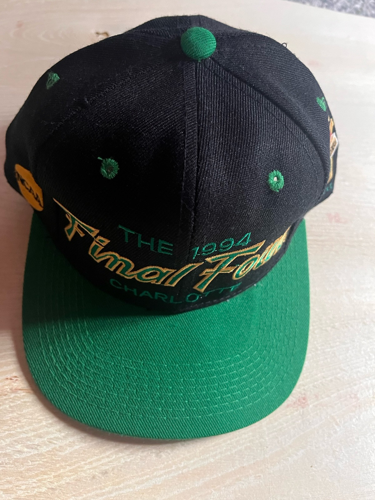 Sports Specialties Co.1994 NCAA Final Four Cap6 7/8The Pro Model Cap-black crown-kelly green visor -2 color kelly on gold Final Four embroidery on front-NCAA logo on side panel-1994 Charlotte opposite side panelSports Specialties tagging inside Cap. Cotton sweatband very clean, has not been worn.A very well preserved RARE original Sports Specialties brand cap. Has not been worn.Small size but great for a nostalgic college sports display.$20 free shipping