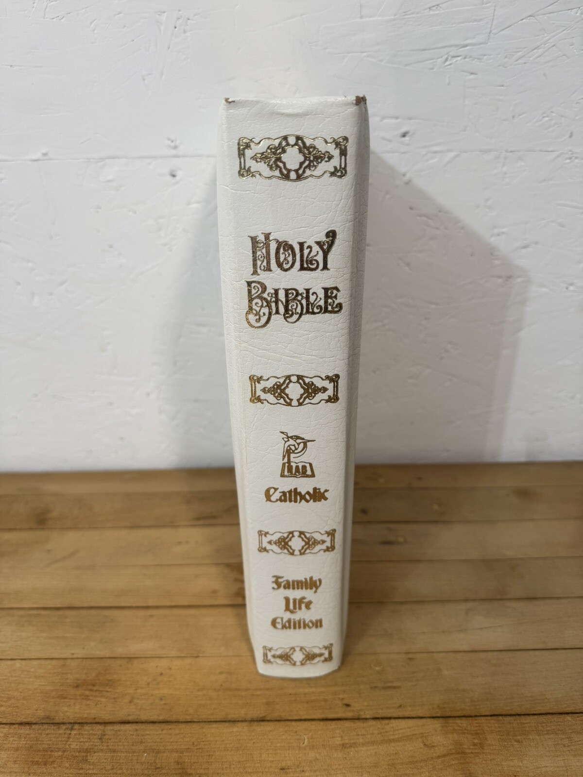 This beautiful white leather-bound Holy Bible is a must-have for any religious collection. With gold-edged pages and a gold-embossed leather cover, it is a true treasure to behold. The Family Life Edition contains the complete text of the Bible, including both the Old and New Testaments, and is published by Catholic Bible Publishers. The book measures 11-3/4" in height, 8-3/4" in length, and 2-1/4" in width, making it the perfect size for reading and display. The authors of this book are unknown and the publication year is 1987, but it is still a valuable and meaningful addition to any collection. Whether you are a believer or just looking for a beautiful piece of decor, this Holy Bible is sure to impress. Overall in very good condition, normal wear and tear to outer leather binding. Gold leaf writing all along spine and outer writings