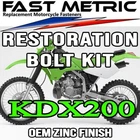 1995-2006 Kawasaki KDX 200 Restoration Kit All Hardware Meets or exceeds OEM specs! This bolt kit has what you need to make accurate OEM repairs and restorations on your Kawasaki KDX 200 off-road motocross bike. FULL ENGINE: Crankcase Bolts and Drain Washer. Top End Kit including Cylinder Head Acorn Flange Nuts, Cylinder Base Nuts, Bolts for Reed Valve/Intake, Power Valve Covers, Exhaust Manifold, Water Neck, and OE match M6 Coolant Drain Bolts w Copper Washer. Left Side Engine Cover (Ignition) and Case Saver bolts. Right Side Engine Covers (Clutch 1pc or 2pc) with the Oil Check Bolt and Copper Washer. Water Pump including the Coolant Drain Bolt and Copper Washer CHASSIS/BODY: Exhaust Pipe Muffler and Silencer Mounting Bolts and Nuts. Frame includes Bolts and Nuts for Head Stay, Lower Subframe Bolts, Ignition Coil, and Motor Mount Nuts (Sorry no motor mount bolts or upper subframe bolt available). Front End includes all bolts for Upper and Lower Tripleclamps, handlebar clamps, Front Brake Caliper, Front Axel Pinch Bolts/Nuts, Front Number Plate, and Fork Guard Bolts. Front Brake Master Cylinder contains Bolts for Perch, Brake Fluid Reservoir Cover Screws, and a new Fuji Lock nut for your Lever pivot bolt. Front Fender Bolts, Collars, and Fender Washers. Front & Rear Brake Rotors Bolts. Fuel Tank Mounting Bolts for Tank, Radiator Shroud Bolts and Collars, and Petcock. Throttle / Clutch Perch Bolts and Pivot Nuts. Shifter / Kick Start bolt. Radiator Mounting Bolts and Washers. Rear Brake Guard Bolts. Rear Brake Master Cylinder and Reservoir Bolts. Rear Fender Mounting Bolts, Washers, and Lock Nuts. Rear Wheel Sprocket Bolt and Chain Adjuster Bolt Sets. Seat / Side Panels Mounting Bolts and Collars. Swing Arm Hardware for Chain Guide, Chain Slider, Chain Rollers, and Brake Line Guides. NOT INCLUDED: Main Motor Mounts, Axles, or Rear Suspension, and Subframe Bolts. All our fasteners are made of high quality heat-treated zinc plated steel. They have been designed and tested to meet or exceed OEM specifications. We guarantee fit and function. Your complete satisfaction is our number one goal! *Compare to Specbolt & Save $$$$$* APPLICATIONS: 1995-2006 Kawasaki KDX 200 Models Your satisfaction is GUARANTEED IF YOU ARE NOT 100% COMPLETELY SATISFIED WITH YOUR FASTENER KIT, YOU MAY RETURN IT WITHIN 30 DAYS OF PURCHASE, OR CONTACT US FOR AN EXCHANGE OR REPLACEMENT! -PAYMENT & SHIPPING- Payment is required upon checkout. FREE DOMESTIC PRIORITY MAIL SHIPPING Check out our other fastener kits for YAMAHA, HONDA, KAWASAKI, SUZUKI, HUSQVARNA, & KTM