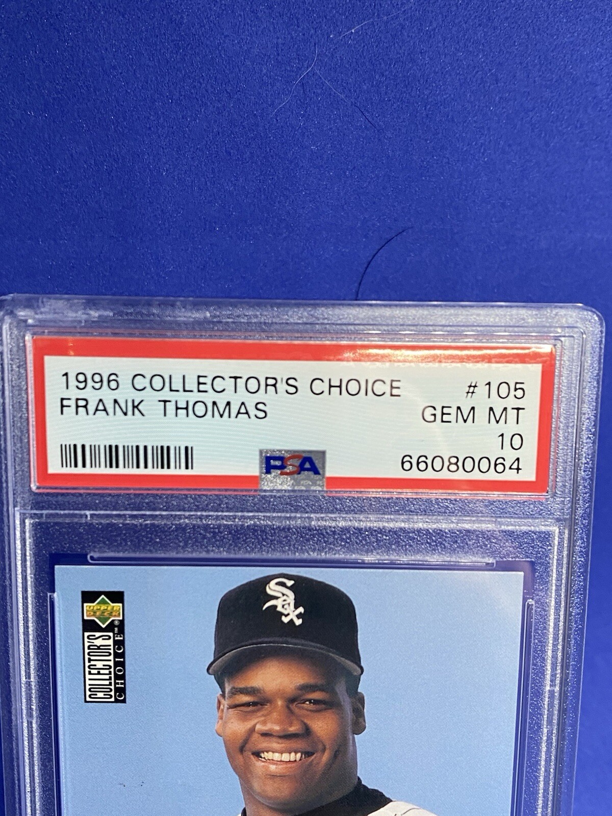 Dive into the world of sports memorabilia with the 1996 Collector's Choice Traditional Threads #105 featuring the legendary Frank Thomas of the Chicago White Sox. The card has been meticulously graded by the Professional Sports Authenticator (PSA), earning a Gem Mint 10 rating, the highest possible grade, indicating its pristine and collectible quality. The card comes from the esteemed 1996 Upper Deck Collector's Choice set, renowned for its exquisite craftsmanship and attention to detail. It is a non-autographed insert that reflects the excellence and legacy of Frank Thomas's career in Major League Baseball (MLB).