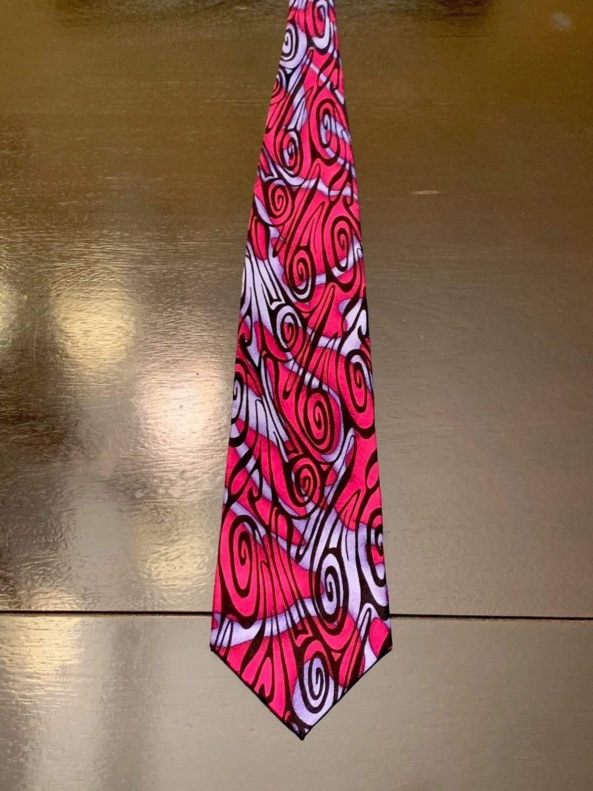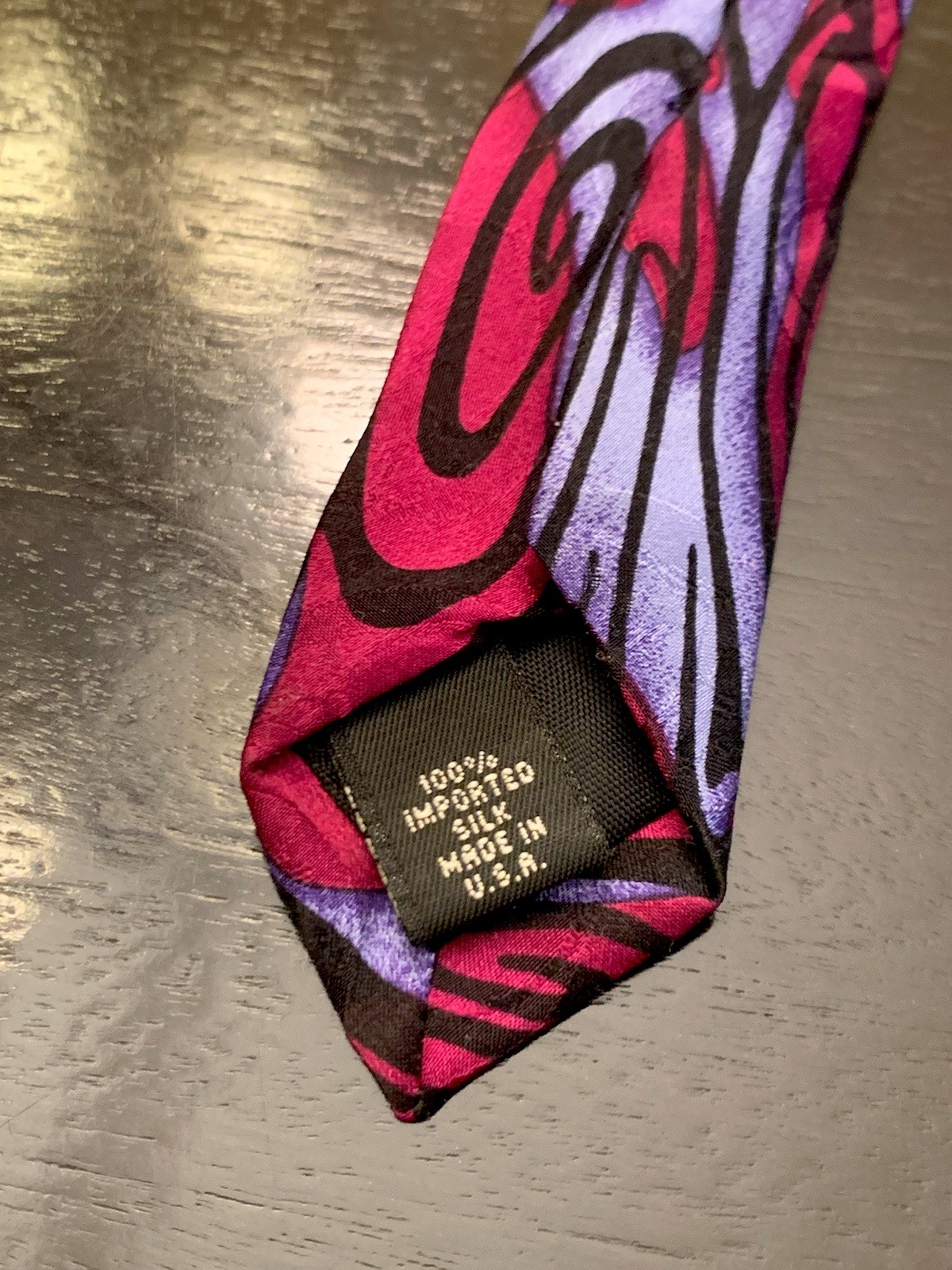This neon fushia black tie with a hologram skull accent is the perfect addition to any Grateful Dead fan's wardrobe. The tie features a geometric pattern with skulls, the year 1996, and Jerry Garcia's name. Made from 100% silk, this vintage tie is of high quality and will make you stand out in any crowd. The tie is a wide short tie, measuring less than 57 inches in length. It is a first set tie from Miracle, a brand known for its unique and eye-catching designs. This tie is perfect for men who want to add a touch of the 90s and Grateful Dead to their outfit. Made in the United States, this tie is a must-have for any collector or fan.