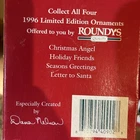 All were found in storage lot, 4 mint ordaments inside okay condition boxes. $2 -Letter to Santa $2 -Seasons greetings $5 -Holiday Friends $9 -Christmas Angel Just trying to limit my possessions! Thanks