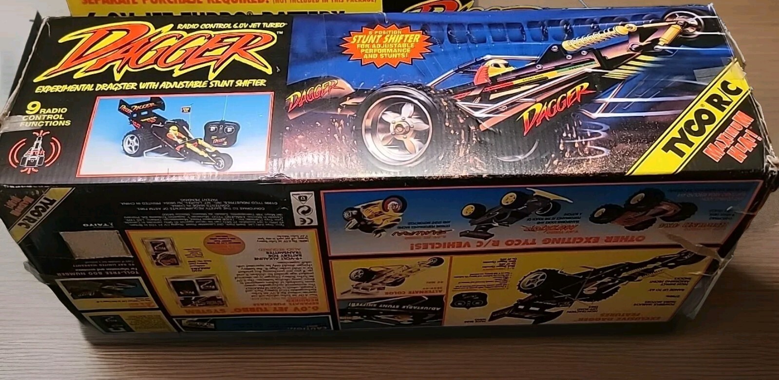 Preowned but in good condition. Box is damaged, but contents inside are in great shape. No battery or instructions include. See pictures for details. *UNTESTED* This vintage TYCO Dagger model car is a great addition to any RC collection. With its sleek black color and rare characteristics, it's sure to catch the eye of any collector or enthusiast. The car is made of durable plastic and features a brushed motor type, making it suitable for both off-road and on-road use. This 2WD drag car comes ready to go with all included parts and is recommended for ages 8 and up. The TYCO Dagger also has a product line of its own, called TYCO R/C Maximum Heat, which adds to its uniqueness and value. Take this lightly used gem for a spin and experience the thrill of vintage RC racing.