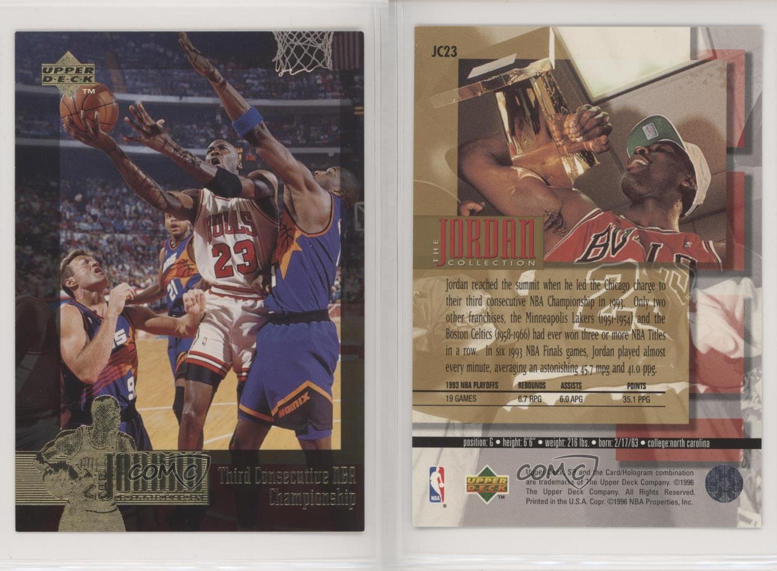 1996 Upper Deck The Jordan Collection Jumbo - Box Set [Base] #JC23 Michael Jordan - Basketball Card - Featuring the Chicago Bulls - Featuring Michael Jordan Search for more: 1996 Upper Deck The Jordan Collection Jumbo Search for more: 1996 Upper Deck The Jordan Collection Jumbo - Box Set [Base] View all of our Listings Auctions Buy It Now About Us Located in the beautiful Pacific Northwest, COMC (Check Out My Cards) is the world's largest consignment service for trading card singles. More than 10,000 people have used our consignment service to list over 50 million trading cards. Find out how we can help you consign your items on eBay by contacting us through eBay messaging. COMC -- "The Safe & Easy Way to Buy & Sell" Representative Image - Select Specific Item above to see image of actual item Representative Image - Select Specific Item above to see image of actual item Raw Condition for Modern Cards Unless otherwise noted, raw modern cards are listed in Near Mint-Mint condition or better. A NM-MT card appears to be Mint at first glance, but upon closer inspection, may exhibit some of the following: minor print defects (e.g. roller marks, print line, dimple), minor scratches, slight edge wear, and slight corner wear. Centering is clearly visible in the images provided and does not factor into our condition assessment. Raw Condition for Vintage Cards Unless otherwise noted, raw vintage cards are listed in Excellent condition or better. An EX card may exhibit some of the following: minor rounding of corners, surface wear, print defects, light scratches, and slight edge wear/chipping. Centering is clearly visible in the images provided and does not factor into our condition assessment. Domestic Shipping Combined shipping for multiple items is available. To receive combined shipping, please ensure all desired items are in your eBay shopping cart before proceeding to checkout. eBay limits orders to 40 items per order. We automatically combine multiple orders placed on the same day. If you place multiple orders on the same day, please contact us to request a refund of applicable shipping costs. Signature confirmation may be required on invoices over $400. All cards are protected and shipped securely. International Shipping COMC offers eBay's International Shipping (EIS) for international orders under $2,500* (see country exceptions below). All duties and import fees are paid at checkout; in the rare event that there are additional import fees upon delivery, these are borne by the buyer. EIS packages route through a shipping hub in Erlanger, KY before shipping to their final destination. Please note that EIS does not allow for combined shipments. The shipping rates are determined by eBay and cannot be adjusted. *Maximum sale price exceptions: Colombia, Kuwait ($2,000); Taiwan ($1,539); Chile, Costa Rica, Guatemala, Honduras, Trinidad and Tobago ($1,000); Antigua and Barbuda, Aruba, Belize, Dominica, Grenada, Philippines, Saint Kitts and Nevis, Saint Lucia, Montserrat, Turks and Caicos Islands ($500); Dominican Republic, El Salvador ($200). Please request a shipping quote through eBay messaging for orders that exceed the maximum sale price supported by eBay's International Shipping. You will be responsible for all duties and import fees for international orders shipped outside the EIS. All cards are protected and shipped securely. Payment COMC does not accept offers on our cards through our eBay storefront. COMC utilizes eBay’s managed payments system. If you are experiencing difficulties making a payment, please contact eBay for assistance. Return Policy Returns are only accepted on the rare occasion the item is not as described. If you are making a return, please initiate the return process through eBay so a mailing label can be provided for you. Prior to listing, our expert team carefully assessed this item to represent it accurately. Please review the description and high-definition images prior to purchasing to ensure this item meets your satisfaction. We welcome you to contact us if you have further questions about this item. Trust and Integrity COMC carefully assesses each item consigned to us to prevent fraudulent items from entering the marketplace. If you believe an item offered on COMC may be fraudulent, please contact us with details so we can investigate the issue. Items we determine are outside our supported items policy may be removed. Last Modified: 5/17/2025 8:55:06 PM PDT
