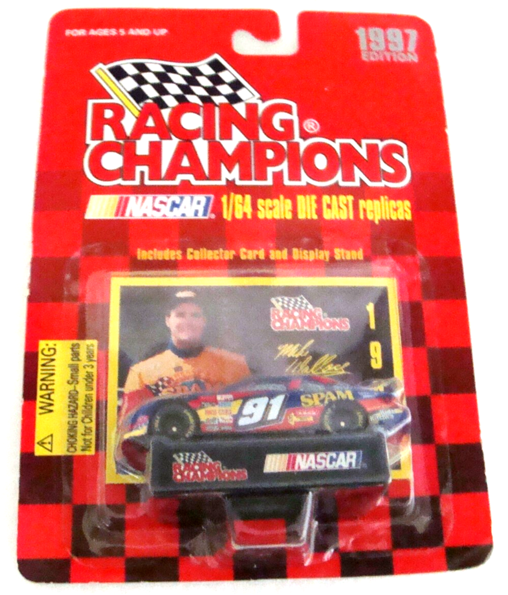 1997 Racing Champions 1:64 Nascar diecast car. Car in new condition on the never opened original blister card bubble. Pkg in good condition. Small upturn on lower corner from storage. Bubble is clear, clean and dent free. Please VIEW all Photos. Car sits on stand. You also receive a 1997 Mike Wallace collector card in same package. SPAM is the primary sponsor on this multi colored Chevy Monte Carlo. White #91 on roof top and door panels. Mike Wallace name above door windows. Large SPAM lettered in yellow on blue hood. SPAM also on uppr rear qtr and red rear panel. Yellow spoiler and valance. Plenty of color and co-sponsors on car. Clear windows. Gray net and interior. Goodyears. Winner to pay $6.85 S/H USPS GA w/tracking. EBMP accepted. Thanks for looking & great luck with your bid. Combo shipping will be $1.00 each for additional 1:64 or 1:87 cars. Please contact me for invoice if the cart option does not work.