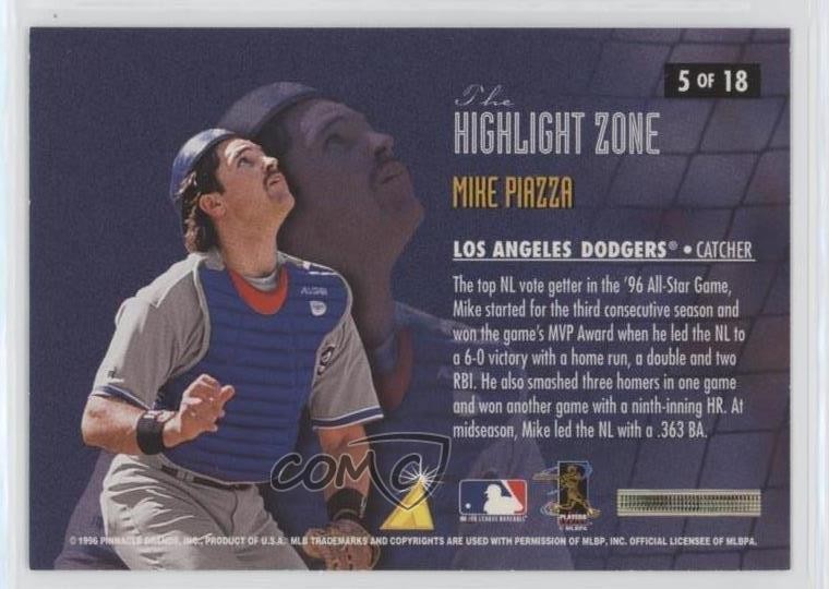 1997 Score - Highlight Zone #5 Mike Piazza - Baseball Card - Featuring the Los Angeles Dodgers - Featuring Mike Piazza Search for more: 1997 Score Search for more: 1997 Score - Highlight Zone View all of our Listings Auctions Buy It Now About Us Located in the beautiful Pacific Northwest, COMC (Check Out My Cards) is the world's largest consignment service for trading card singles. More than 10,000 people have used our consignment service to list over 50 million trading cards. Find out how we can help you consign your items on eBay by contacting us through eBay messaging. COMC -- "The Safe & Easy Way to Buy & Sell" Representative Image - Select Specific Item above to see image of actual item Representative Image - Select Specific Item above to see image of actual item Raw Condition for Modern Cards Unless otherwise noted, raw modern cards are listed in Near Mint-Mint condition or better. A NM-MT card appears to be Mint at first glance, but upon closer inspection, may exhibit some of the following: minor print defects (e.g. roller marks, print line, dimple), minor scratches, slight edge wear, and slight corner wear. Centering is clearly visible in the images provided and does not factor into our condition assessment. Raw Condition for Vintage Cards Unless otherwise noted, raw vintage cards are listed in Excellent condition or better. An EX card may exhibit some of the following: minor rounding of corners, surface wear, print defects, light scratches, and slight edge wear/chipping. Centering is clearly visible in the images provided and does not factor into our condition assessment. Domestic Shipping Combined shipping for multiple items is available. To receive combined shipping, please ensure all desired items are in your eBay shopping cart before proceeding to checkout. eBay limits orders to 40 items per order. We automatically combine multiple orders placed on the same day. If you place multiple orders on the same day, please contact us to request a refund of applicable shipping costs. Signature confirmation may be required on invoices over $400. All cards are protected and shipped securely. International Shipping COMC offers eBay's International Shipping (EIS) for international orders under $2,500* (see country exceptions below). All duties and import fees are paid at checkout; in the rare event that there are additional import fees upon delivery, these are borne by the buyer. EIS packages route through a shipping hub in Erlanger, KY before shipping to their final destination. Please note that EIS does not allow for combined shipments. The shipping rates are determined by eBay and cannot be adjusted. *Maximum sale price exceptions: Colombia, Kuwait ($2,000); Taiwan ($1,539); Chile, Costa Rica, Guatemala, Honduras, Trinidad and Tobago ($1,000); Antigua and Barbuda, Aruba, Belize, Dominica, Grenada, Philippines, Saint Kitts and Nevis, Saint Lucia, Montserrat, Turks and Caicos Islands ($500); Dominican Republic, El Salvador ($200). Please request a shipping quote through eBay messaging for orders that exceed the maximum sale price supported by eBay's International Shipping. You will be responsible for all duties and import fees for international orders shipped outside the EIS. All cards are protected and shipped securely. Payment COMC does not accept offers on our cards through our eBay storefront. COMC utilizes eBay’s managed payments system. If you are experiencing difficulties making a payment, please contact eBay for assistance. Return Policy Returns are only accepted on the rare occasion the item is not as described. If you are making a return, please initiate the return process through eBay so a mailing label can be provided for you. Prior to listing, our expert team carefully assessed this item to represent it accurately. Please review the description and high-definition images prior to purchasing to ensure this item meets your satisfaction. We welcome you to contact us if you have further questions about this item. Trust and Integrity COMC carefully assesses each item consigned to us to prevent fraudulent items from entering the marketplace. If you believe an item offered on COMC may be fraudulent, please contact us with details so we can investigate the issue. Items we determine are outside our supported items policy may be removed. Last Modified: 6/26/2025 1:00:34 AM PDT