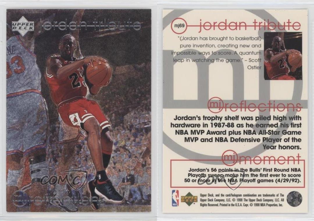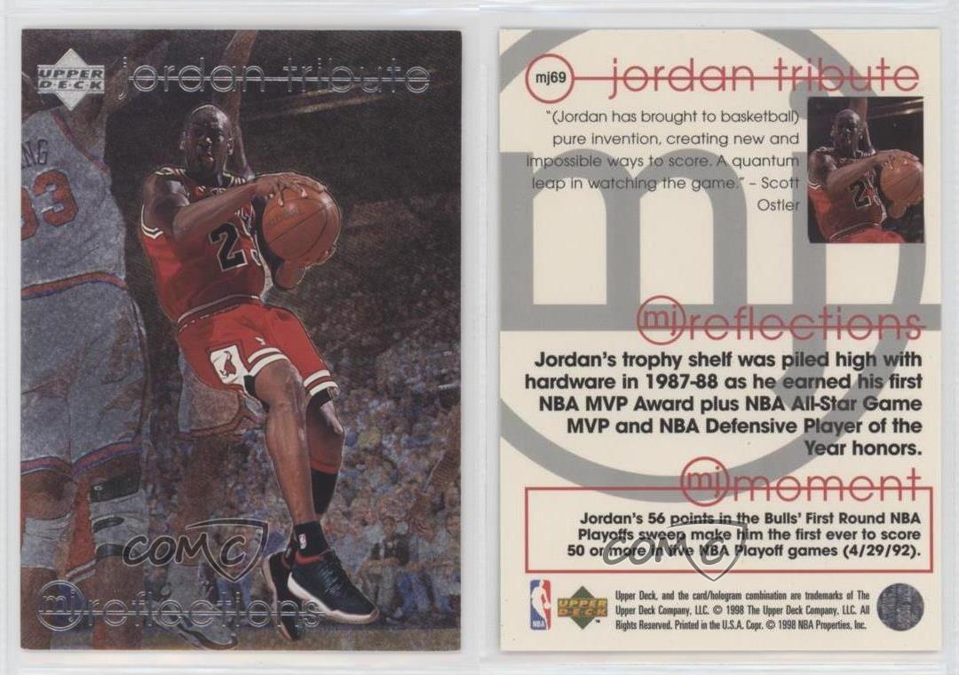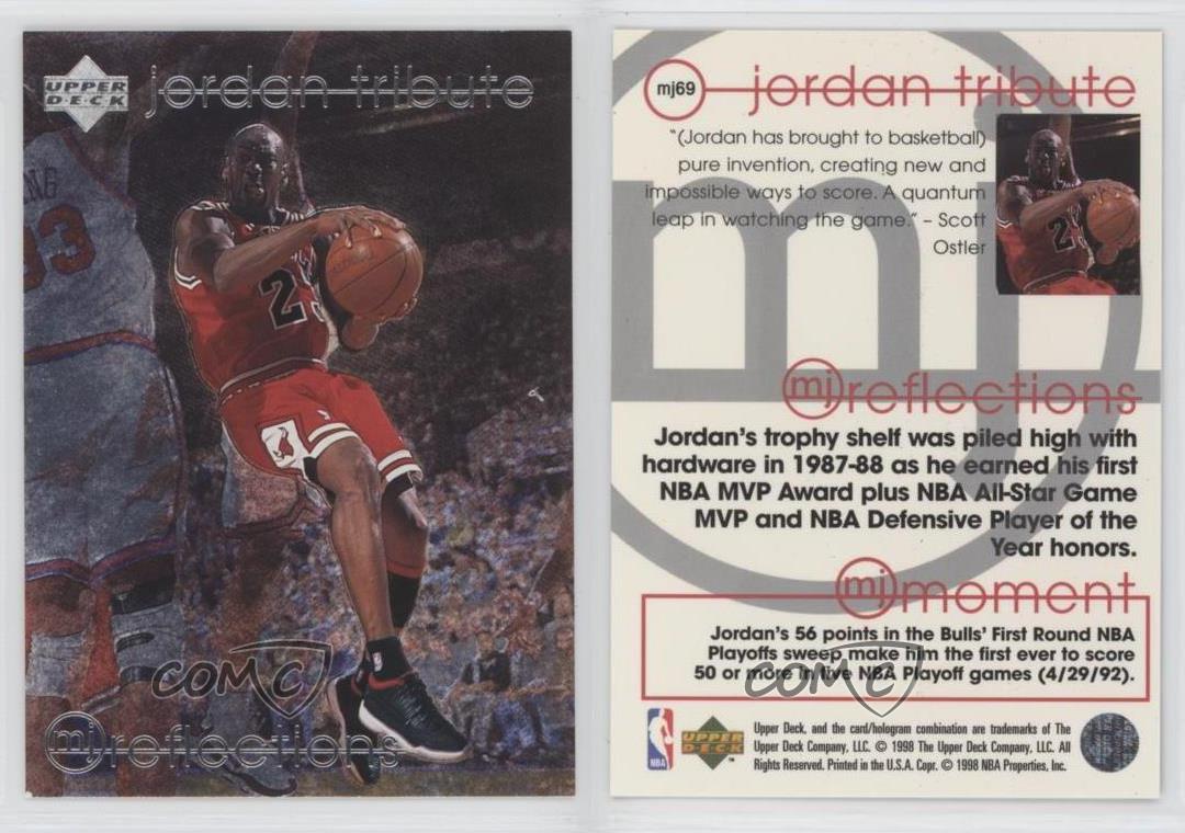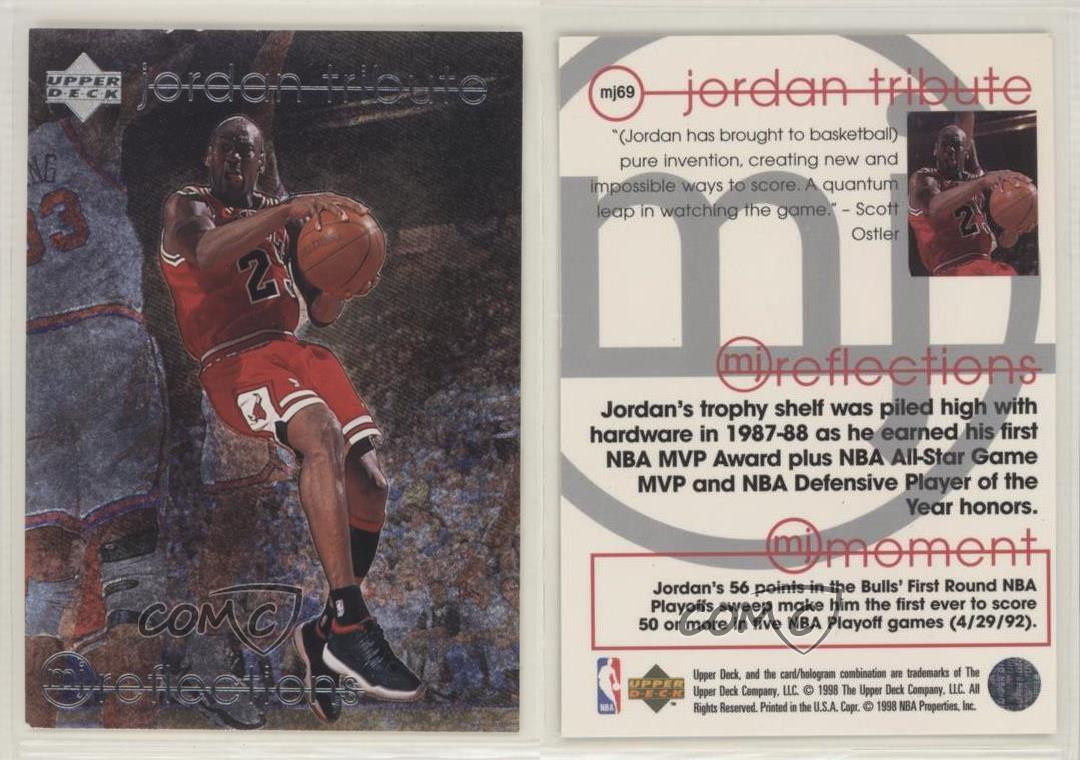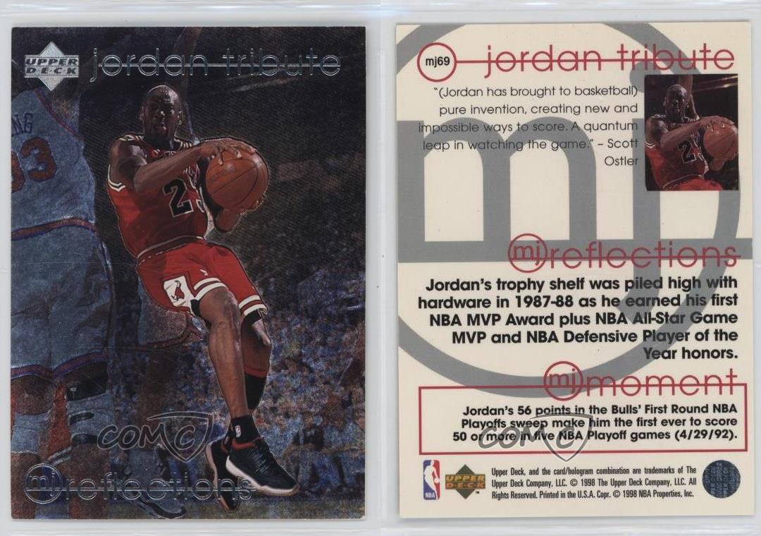 1997-98 Upper Deck Michael Jordan Tribute - [Base] #mj69 Michael Jordan - Basketball Card - Featuring the Chicago Bulls - Featuring Michael Jordan Search for more: 1997-98 Upper Deck Michael Jordan Tribute Search for more: 1997-98 Upper Deck Michael Jordan Tribute - [Base] View all of our Listings Auctions Buy It Now About Us Located in the beautiful Pacific Northwest, COMC (Check Out My Cards) is the world's largest consignment service for trading card singles. More than 10,000 people have used our consignment service to list over 50 million trading cards. Find out how we can help you consign your items on eBay by contacting us through eBay messaging. COMC -- "The Safe & Easy Way to Buy & Sell" Representative Image - Select Specific Item above to see image of actual item Representative Image - Select Specific Item above to see image of actual item Raw Condition for Modern Cards Unless otherwise noted, raw modern cards are listed in Near Mint-Mint condition or better. A NM-MT card appears to be Mint at first glance, but upon closer inspection, may exhibit some of the following: minor print defects (e.g. roller marks, print line, dimple), minor scratches, slight edge wear, and slight corner wear. Centering is clearly visible in the images provided and does not factor into our condition assessment. Raw Condition for Vintage Cards Unless otherwise noted, raw vintage cards are listed in Excellent condition or better. An EX card may exhibit some of the following: minor rounding of corners, surface wear, print defects, light scratches, and slight edge wear/chipping. Centering is clearly visible in the images provided and does not factor into our condition assessment. Domestic Shipping Combined shipping for multiple items is available. To receive combined shipping, please ensure all desired items are in your eBay shopping cart before proceeding to checkout. eBay limits orders to 40 items per order. We automatically combine multiple orders placed on the same day. If you place multiple orders on the same day, please contact us to request a refund of applicable shipping costs. Signature confirmation may be required on invoices over $400. All cards are protected and shipped securely. International Shipping COMC offers eBay's International Shipping (EIS) for international orders under $2,500* (see country exceptions below). All duties and import fees are paid at checkout; in the rare event that there are additional import fees upon delivery, these are borne by the buyer. EIS packages route through a shipping hub in Erlanger, KY before shipping to their final destination. Please note that EIS does not allow for combined shipments. The shipping rates are determined by eBay and cannot be adjusted. *Maximum sale price exceptions: Colombia, Kuwait ($2,000); Taiwan ($1,539); Chile, Costa Rica, Guatemala, Honduras, Trinidad and Tobago ($1,000); Antigua and Barbuda, Aruba, Belize, Dominica, Grenada, Philippines, Saint Kitts and Nevis, Saint Lucia, Montserrat, Turks and Caicos Islands ($500); Dominican Republic, El Salvador ($200). Please request a shipping quote through eBay messaging for orders that exceed the maximum sale price supported by eBay's International Shipping. You will be responsible for all duties and import fees for international orders shipped outside the EIS. All cards are protected and shipped securely. Payment COMC does not accept offers on our cards through our eBay storefront. COMC utilizes eBay’s managed payments system. If you are experiencing difficulties making a payment, please contact eBay for assistance. Return Policy Returns are only accepted on the rare occasion the item is not as described. If you are making a return, please initiate the return process through eBay so a mailing label can be provided for you. Prior to listing, our expert team carefully assessed this item to represent it accurately. Please review the description and high-definition images prior to purchasing to ensure this item meets your satisfaction. We welcome you to contact us if you have further questions about this item. Trust and Integrity COMC carefully assesses each item consigned to us to prevent fraudulent items from entering the marketplace. If you believe an item offered on COMC may be fraudulent, please contact us with details so we can investigate the issue. Items we determine are outside our supported items policy may be removed. Last Modified: 7/2/2025 2:50:18 AM PDT