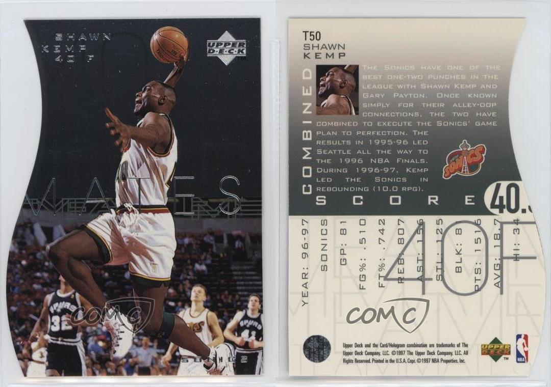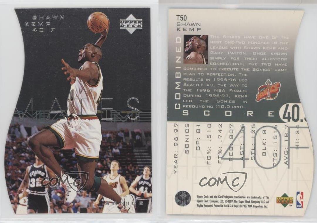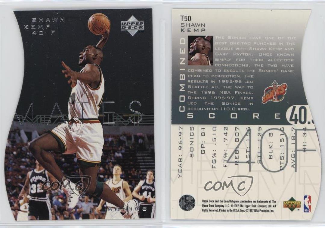 1997-98 Upper Deck - Teammates #T50 Shawn Kemp - Basketball Card - Featuring the Seattle Supersonics - Featuring Shawn Kemp Search for more: 1997-98 Upper Deck Search for more: 1997-98 Upper Deck - Teammates View all of our Listings Auctions Buy It Now About Us Located in the beautiful Pacific Northwest, COMC (Check Out My Cards) is the world's largest consignment service for trading card singles. More than 10,000 people have used our consignment service to list over 50 million trading cards. Find out how we can help you consign your items on eBay by contacting us through eBay messaging. COMC -- "The Safe & Easy Way to Buy & Sell" Representative Image - Select Specific Item above to see image of actual item Representative Image - Select Specific Item above to see image of actual item Raw Condition for Modern Cards Unless otherwise noted, raw modern cards are listed in Near Mint-Mint condition or better. A NM-MT card appears to be Mint at first glance, but upon closer inspection, may exhibit some of the following: minor print defects (e.g. roller marks, print line, dimple), minor scratches, slight edge wear, and slight corner wear. Centering is clearly visible in the images provided and does not factor into our condition assessment. Raw Condition for Vintage Cards Unless otherwise noted, raw vintage cards are listed in Excellent condition or better. An EX card may exhibit some of the following: minor rounding of corners, surface wear, print defects, light scratches, and slight edge wear/chipping. Centering is clearly visible in the images provided and does not factor into our condition assessment. Domestic Shipping Combined shipping for multiple items is available. To receive combined shipping, please ensure all desired items are in your eBay shopping cart before proceeding to checkout. eBay limits orders to 40 items per order. We automatically combine multiple orders placed on the same day. If you place multiple orders on the same day, please contact us to request a refund of applicable shipping costs. Signature confirmation may be required on invoices over $400. All cards are protected and shipped securely. International Shipping COMC offers eBay's International Shipping (EIS) for international orders under $2,500* (see country exceptions below). All duties and import fees are paid at checkout; in the rare event that there are additional import fees upon delivery, these are borne by the buyer. EIS packages route through a shipping hub in Erlanger, KY before shipping to their final destination. Please note that EIS does not allow for combined shipments. The shipping rates are determined by eBay and cannot be adjusted. *Maximum sale price exceptions: Colombia, Kuwait ($2,000); Taiwan ($1,539); Chile, Costa Rica, Guatemala, Honduras, Trinidad and Tobago ($1,000); Antigua and Barbuda, Aruba, Belize, Dominica, Grenada, Philippines, Saint Kitts and Nevis, Saint Lucia, Montserrat, Turks and Caicos Islands ($500); Dominican Republic, El Salvador ($200). Please request a shipping quote through eBay messaging for orders that exceed the maximum sale price supported by eBay's International Shipping. You will be responsible for all duties and import fees for international orders shipped outside the EIS. All cards are protected and shipped securely. Payment COMC does not accept offers on our cards through our eBay storefront. COMC utilizes eBay’s managed payments system. If you are experiencing difficulties making a payment, please contact eBay for assistance. Return Policy Returns are only accepted on the rare occasion the item is not as described. If you are making a return, please initiate the return process through eBay so a mailing label can be provided for you. Prior to listing, our expert team carefully assessed this item to represent it accurately. Please review the description and high-definition images prior to purchasing to ensure this item meets your satisfaction. We welcome you to contact us if you have further questions about this item. Trust and Integrity COMC carefully assesses each item consigned to us to prevent fraudulent items from entering the marketplace. If you believe an item offered on COMC may be fraudulent, please contact us with details so we can investigate the issue. Items we determine are outside our supported items policy may be removed. Last Modified: 6/25/2025 10:15:15 PM PDT
