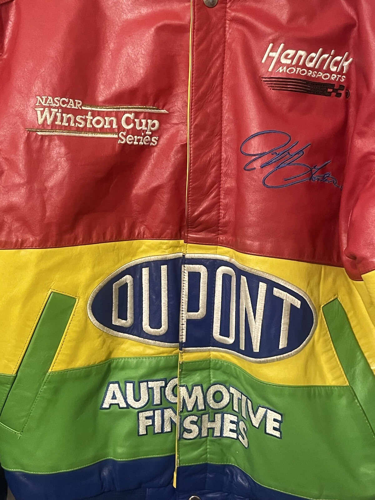 Get your hands on this vintage 1998 DUPONT NASCAR Jeff Gordon leather rainbow jacket, perfect for any NASCAR fan. This small jacket is made in the USA and features a multi-color design with Jeff Gordon's name and team logo prominently displayed. The jacket is officially licensed by Hendrick Motorsports and is perfect for men who want to show their support for their favorite NASCAR driver. The jacket is made by Chase JH Design and is a must-have for any collector or fan of Jeff Gordon. Don't miss out on the chance to own a piece of NASCAR history. This jacket is in used condition. It needs to be cleaned professionally. Still has a lot of life