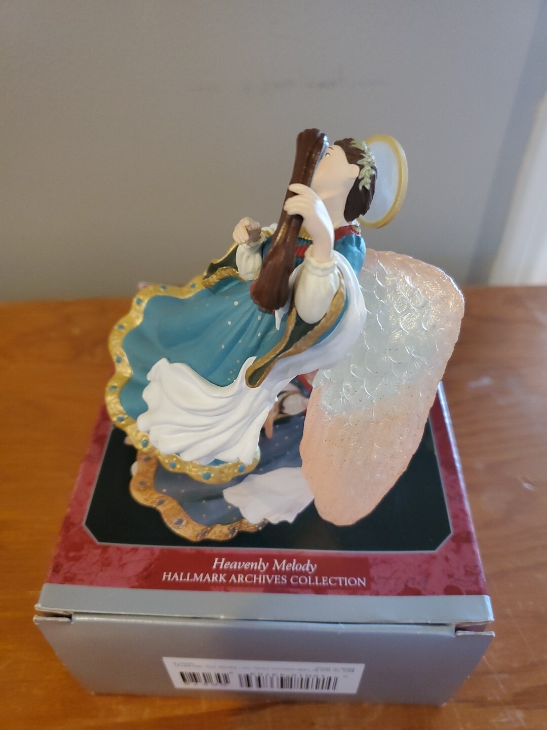 This is a vintage 1998 Hallmark Angel "Heavenly Melody" Keepsake Christmas Ornament in its original box. The ornament features a small multicolor angel figurine with a height of 5.25 inches, a length of 4 inches, and a width of 2.75 inches. It is part of the Angel franchise and collection, perfect for Christmas decor. The ornament is in excellent condition with no chips or cracks. The box has some scuffing around the corners, but no damage to the ornament. Located on Hallmark Shelf