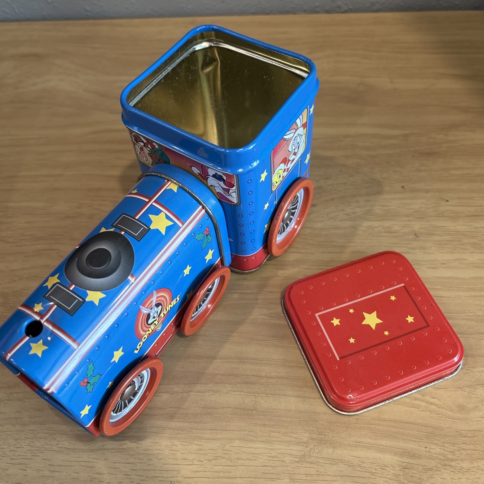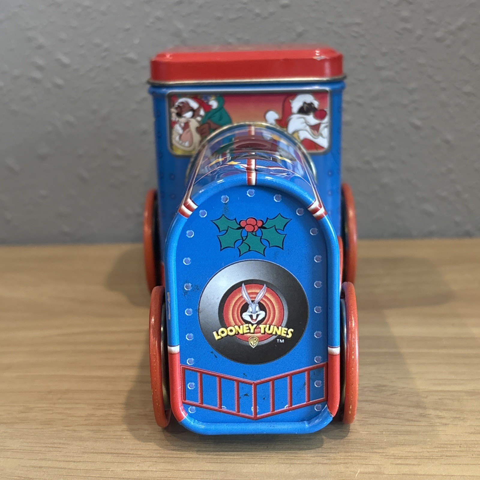 This 1998 Looney Tunes Christmas Tin Train features beloved characters Bugs Bunny, Taz, Tweety Bird, and Sylvester. The colorful and vibrant design is perfect for any Looney Tunes fan or collector. Made of durable tin, this train is a unique addition to any collection. The tin train is in great shape and has been carefully stored over the years. It would make a fantastic gift for any animation enthusiast or collector. Add this piece to your collection today and enjoy the whimsy of Looney Tunes.
