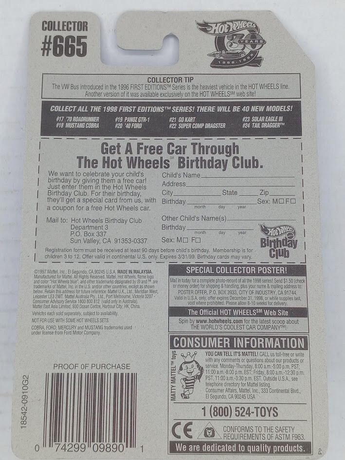 1998 Lot Of 4 Hot Wheels First Editions Series #665, #654, #657, #651 SKU#101476 Look closely at the pictures to see further details. We ships USPS PLEASE see photos for detailed condition!! AC PLEASE LOOK AT THE PHOTOS CAREFULLY BEFORE PURCHASING!! If you are purchasing more than one item from us and would like combined shipping, PLEASE request an adjusted invoice from us while still in the cart and BEFORE paying. eBay does not usually calculate combined shipping accurately and you might get overcharged. Please be aware that when we photograph items, we use lighting that will show the details well. Although we try to present the product as accurately as possible, the lighting may affect the overall look of the item by appearing lighter/darker or possibly a different hue than the actual item. Depending on the type of lighting you have in your home, there may be some differences between the photos and the actual item. If this is a concern of yours, please feel free to request additional photos made in natural lighting or ask for a more detailed description of the item PRIOR TO PURCHASE! PLEASE NOTE: We greatly appreciate your interest in our item for sale. We look forward to a pleasant, quick and satisfying transaction for everybody, so please note the following information before bidding. Thank you! ITEM DESCRIPTIONS: * We will try to describe items well and provide plenty of photos. Please review these carefully before bidding or purchasing. * Only the items pictured and described are what you will receive when purchased. * We will occasionally offer an item clearly marked "AS-IS". This means that we are not sure if it works because we are unable to test it for whatever reason. We will offer these at a discounted price then a similar "working" item. It is possible that these items will work fine, but it also is possible that these items are more useful for their parts. Please only bid on or purchase these items if you are well aware of this, as we will only provide refunds of actual item price (no shipping cost refunds) for these items. * If you have any questions that aren't addressed by the descriptions or photos, please feel free to ask before you bid. * There may be bends, dents or parts of the blister that have minor issues due to long term storage. Such things will be pointed out under the description, please look closely at the pictures for further details. SHIPPING: * We usually do not offer shipping to international addresses, but ARE WILLING TO TAKE CONSIDERATIONS. * We try to pack items as carefully as possible, but damage may occur during shipping. If you receive an item that was damaged in shipping, please contact us and we will work with you to resolve the problem. * We will combine shipping costs for all items the same buyer purchases from us within 2 days. Please wait to pay for items until you're done shopping with us. Please contact us if you're expecting to buy more items from us, or to have us adjust the shipping costs. * We will usually ship items out within 24 hours of payment being received Sunday through Friday at noon. We will notify the buyer if there will be a delay in shipping for some reason. Please allow additional time for holidays and weekends when the post office is closed. If payment is received after noon (EST) on Friday, the item might not be shipped until the following Monday. * We do try to recycle shipping materials as much as possible. RETURNS: We abide by eBay's Money Back Guarantee. We definitely want our customers to be happy with their purchase! You may return an item within 30 days of receiving it with the following guidelines: * If the item is defective or damaged (unless we clearly marked the listing "AS-IS"), the buyer will receive a full refund after the buyer returns it and it is received by us. Customers who falsely claim their item is defective, damaged, or not as described in order to receive a full refund and free return shipping will be permanently blocked from making future purchases from us. * If the item is as described (including "AS-IS" items) and the buyer decides for any other reason than defective/damaged to return it, only the actual price of the item will be refunded once it has been returned and it is received by us. The buyer will be asked to pay all original and return shipping charges. This includes all reasons other than defective/damaged, including wrong size, wrong type, changed mind, etc. All "AS-IS" items will fall into this category of return. Please make sure the item is what you want before purchasing it. * Please contact us before initiating a refund request. FEEDBACK: We always leave feedback at the end of transaction. We consider the transaction to be over when we receive feedback from the buyer confirming the item arrived satisfactorily. If you are unsatisfied with your purchase please contact us before leaving neutral or negative feedback. WE APPRECIATE POSITIVE FEEDBACK IF YOU ARE SATISFIED WITH YOUR PURCHASE! THANK YOU FOR YOUR INTEREST IN THIS ITEM! !