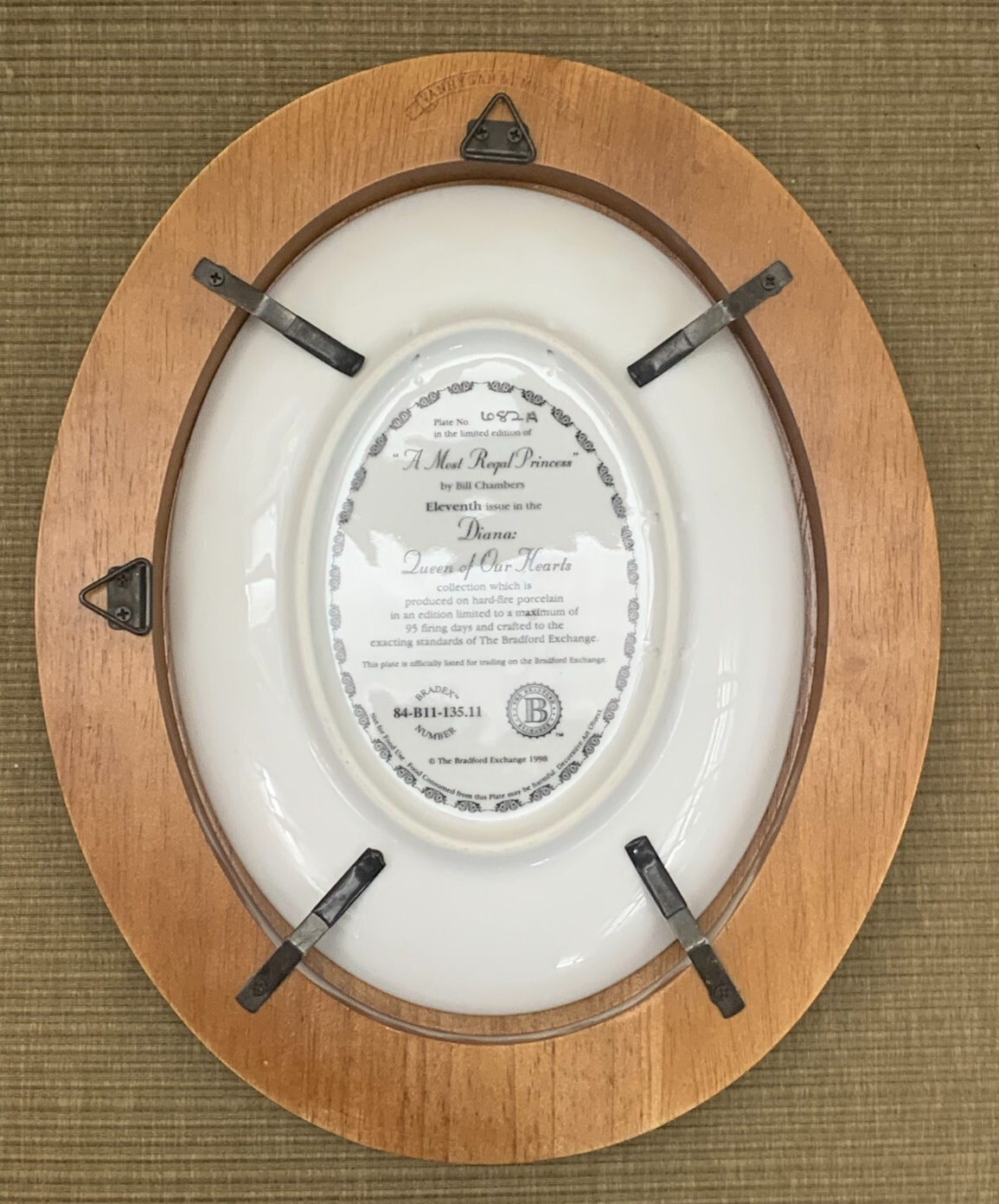 Plate # 682 A "A Most Regal Princess" by Bill Chambers Eleventh issue in Diana: Queen of Our Hearts 1998, Bradford Exchange. Oval porcelain plate is in a wood frame with gold edging. A few tiny flaws on wood and gold, Diana is in pristine shape. Measures 9" x 11 1/2" x 1 1/4" Fast shipping, quality packed, smoke-free household, trackable. Thanks for looking :)