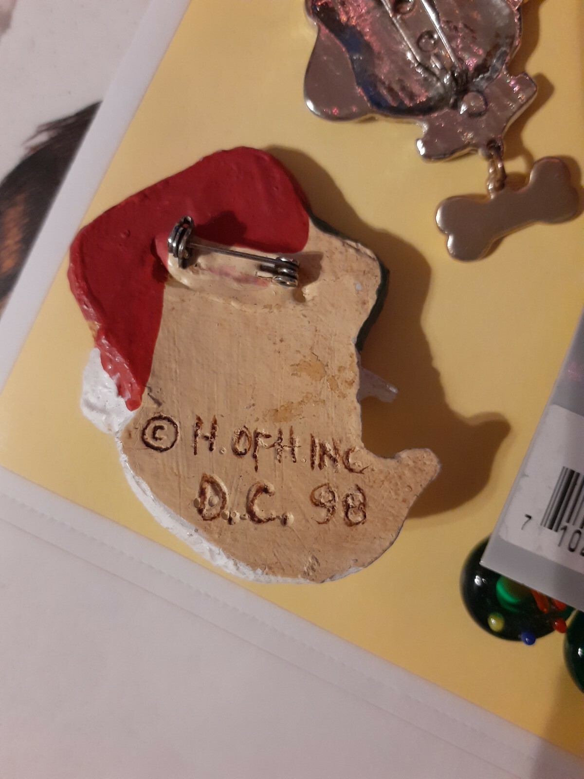 House of Hatten 1998 Santa Brooch & Other Christmas Jewelry. VERY nice collection. The House of Hatten brooch measures 2 1/2" tall. Also getting, glass Wreath earrings, new. Puppy dog Santa pin, pre-worn. Rhinestone stocking pendant and necklace (18" to 20"). Presents pin. Everything shown.