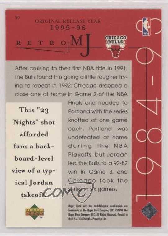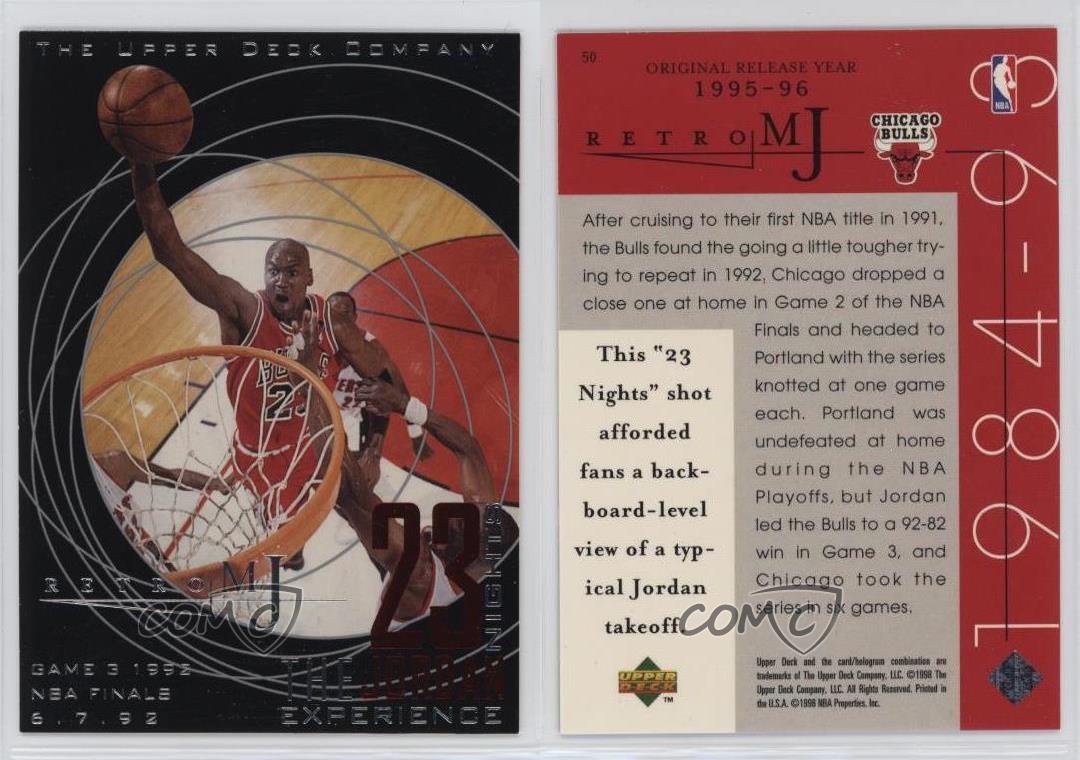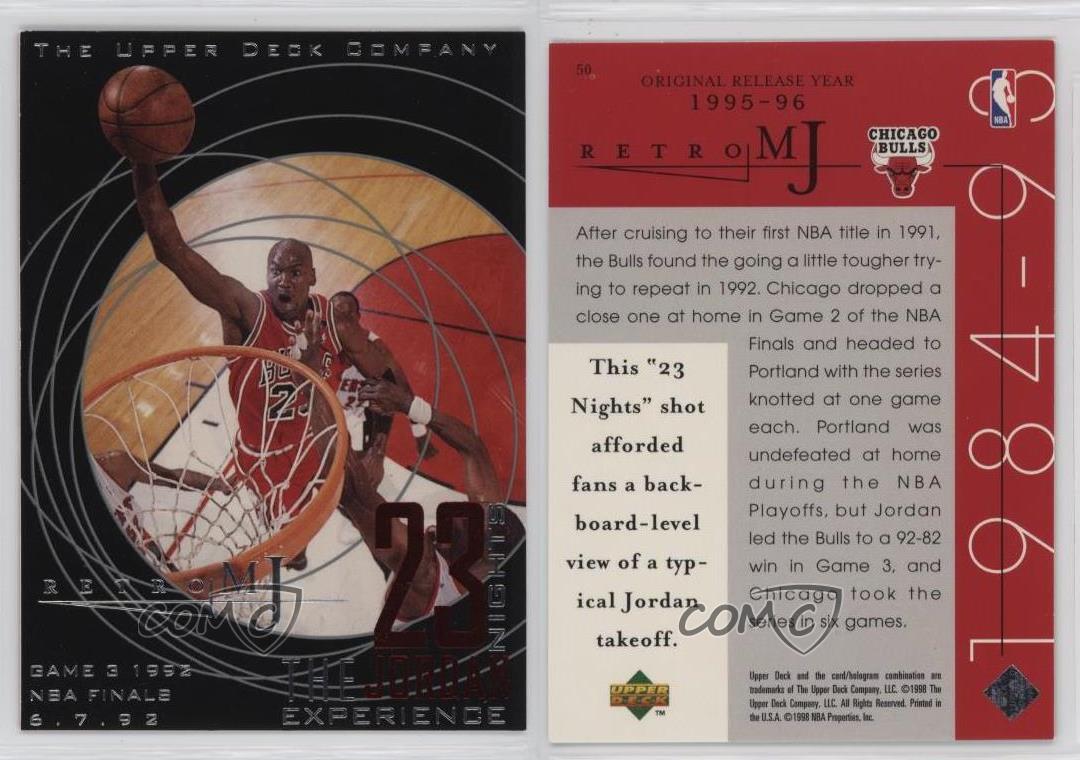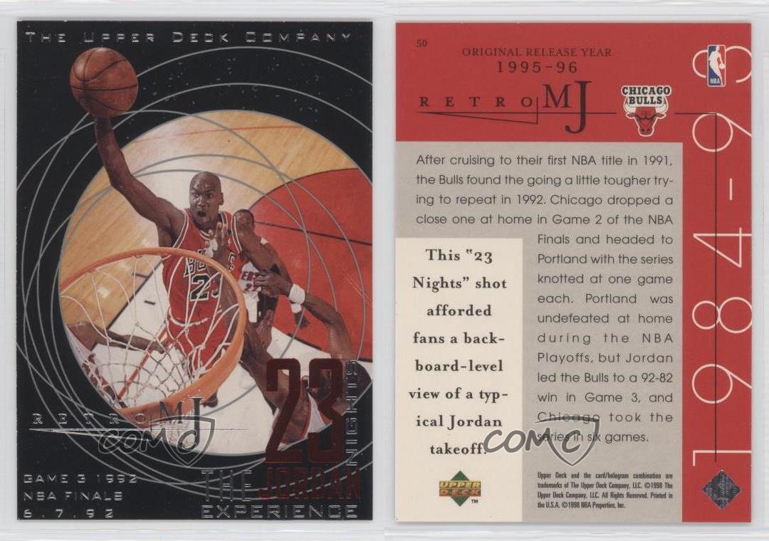 1998 Upper Deck MJ Career Collection - [Base] #50 Retro MJ - Michael Jordan - Basketball Card - Featuring the Chicago Bulls - Featuring Michael Jordan Search for more: 1998 Upper Deck MJ Career Collection Search for more: 1998 Upper Deck MJ Career Collection - [Base] View all of our Listings Auctions Buy It Now About Us Located in the beautiful Pacific Northwest, COMC (Check Out My Cards) is the world's largest consignment service for trading card singles. More than 10,000 people have used our consignment service to list over 50 million trading cards. Find out how we can help you consign your items on eBay by contacting us through eBay messaging. COMC -- "The Safe & Easy Way to Buy & Sell" Representative Image - Select Specific Item above to see image of actual item Representative Image - Select Specific Item above to see image of actual item Raw Condition for Modern Cards Unless otherwise noted, raw modern cards are listed in Near Mint-Mint condition or better. A NM-MT card appears to be Mint at first glance, but upon closer inspection, may exhibit some of the following: minor print defects (e.g. roller marks, print line, dimple), minor scratches, slight edge wear, and slight corner wear. Centering is clearly visible in the images provided and does not factor into our condition assessment. Raw Condition for Vintage Cards Unless otherwise noted, raw vintage cards are listed in Excellent condition or better. An EX card may exhibit some of the following: minor rounding of corners, surface wear, print defects, light scratches, and slight edge wear/chipping. Centering is clearly visible in the images provided and does not factor into our condition assessment. Domestic Shipping Combined shipping for multiple items is available. To receive combined shipping, please ensure all desired items are in your eBay shopping cart before proceeding to checkout. eBay limits orders to 40 items per order. We automatically combine multiple orders placed on the same day. If you place multiple orders on the same day, please contact us to request a refund of applicable shipping costs. Signature confirmation may be required on invoices over $400. All cards are protected and shipped securely. International Shipping COMC offers eBay's International Shipping (EIS) for international orders under $2,500* (see country exceptions below). All duties and import fees are paid at checkout; in the rare event that there are additional import fees upon delivery, these are borne by the buyer. EIS packages route through a shipping hub in Erlanger, KY before shipping to their final destination. Please note that EIS does not allow for combined shipments. The shipping rates are determined by eBay and cannot be adjusted. *Maximum sale price exceptions: Colombia, Kuwait ($2,000); Taiwan ($1,539); Chile, Costa Rica, Guatemala, Honduras, Trinidad and Tobago ($1,000); Antigua and Barbuda, Aruba, Belize, Dominica, Grenada, Philippines, Saint Kitts and Nevis, Saint Lucia, Montserrat, Turks and Caicos Islands ($500); Dominican Republic, El Salvador ($200). Please request a shipping quote through eBay messaging for orders that exceed the maximum sale price supported by eBay's International Shipping. You will be responsible for all duties and import fees for international orders shipped outside the EIS. All cards are protected and shipped securely. Payment COMC does not accept offers on our cards through our eBay storefront. COMC utilizes eBay’s managed payments system. If you are experiencing difficulties making a payment, please contact eBay for assistance. Return Policy Returns are only accepted on the rare occasion the item is not as described. If you are making a return, please initiate the return process through eBay so a mailing label can be provided for you. Prior to listing, our expert team carefully assessed this item to represent it accurately. Please review the description and high-definition images prior to purchasing to ensure this item meets your satisfaction. We welcome you to contact us if you have further questions about this item. Trust and Integrity COMC carefully assesses each item consigned to us to prevent fraudulent items from entering the marketplace. If you believe an item offered on COMC may be fraudulent, please contact us with details so we can investigate the issue. Items we determine are outside our supported items policy may be removed. Last Modified: 7/5/2025 3:10:07 PM PDT