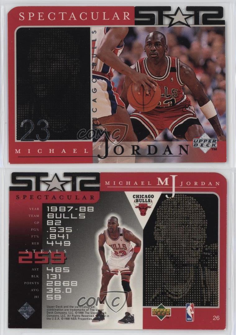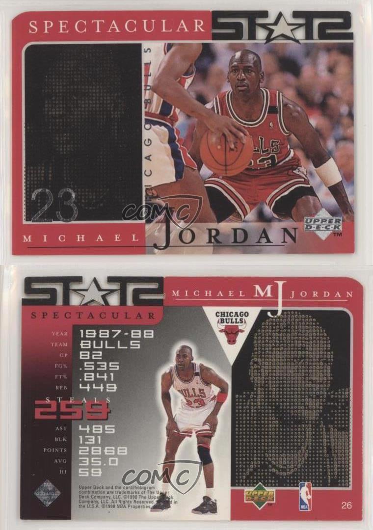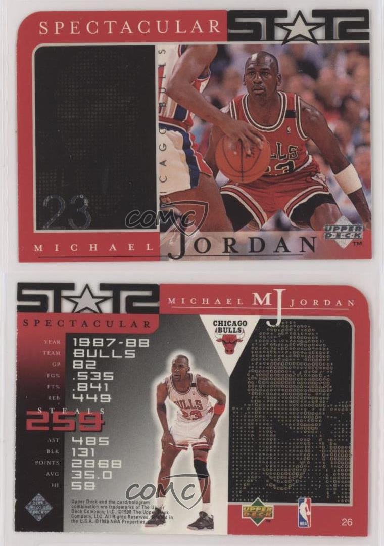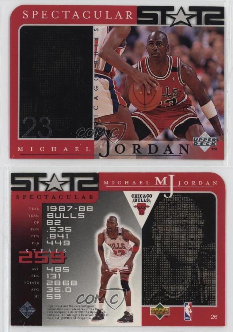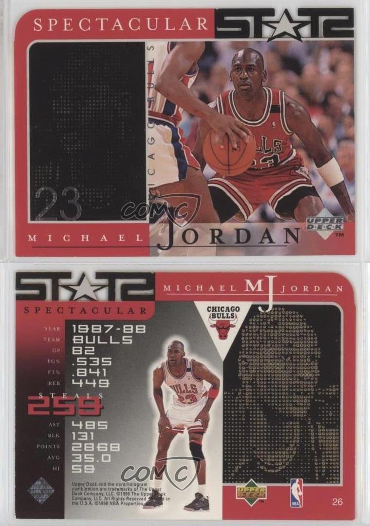 1998 Upper Deck MJ Career Collection - [Base] #26 Spectacular Stats - Michael Jordan - Basketball Card - Featuring the Chicago Bulls - Featuring Michael Jordan Search for more: 1998 Upper Deck MJ Career Collection Search for more: 1998 Upper Deck MJ Career Collection - [Base] View all of our Listings Auctions Buy It Now About Us Located in the beautiful Pacific Northwest, COMC (Check Out My Cards) is the world's largest consignment service for trading card singles. More than 10,000 people have used our consignment service to list over 50 million trading cards. Find out how we can help you consign your items on eBay by contacting us through eBay messaging. COMC -- "The Safe & Easy Way to Buy & Sell" Representative Image - Select Specific Item above to see image of actual item Representative Image - Select Specific Item above to see image of actual item Raw Condition for Modern Cards Unless otherwise noted, raw modern cards are listed in Near Mint-Mint condition or better. A NM-MT card appears to be Mint at first glance, but upon closer inspection, may exhibit some of the following: minor print defects (e.g. roller marks, print line, dimple), minor scratches, slight edge wear, and slight corner wear. Centering is clearly visible in the images provided and does not factor into our condition assessment. Raw Condition for Vintage Cards Unless otherwise noted, raw vintage cards are listed in Excellent condition or better. An EX card may exhibit some of the following: minor rounding of corners, surface wear, print defects, light scratches, and slight edge wear/chipping. Centering is clearly visible in the images provided and does not factor into our condition assessment. Domestic Shipping Combined shipping for multiple items is available. To receive combined shipping, please ensure all desired items are in your eBay shopping cart before proceeding to checkout. eBay limits orders to 40 items per order. We automatically combine multiple orders placed on the same day. If you place multiple orders on the same day, please contact us to request a refund of applicable shipping costs. Signature confirmation may be required on invoices over $400. All cards are protected and shipped securely. International Shipping COMC offers eBay's International Shipping (EIS) for international orders under $2,500* (see country exceptions below). All duties and import fees are paid at checkout; in the rare event that there are additional import fees upon delivery, these are borne by the buyer. EIS packages route through a shipping hub in Erlanger, KY before shipping to their final destination. Please note that EIS does not allow for combined shipments. The shipping rates are determined by eBay and cannot be adjusted. *Maximum sale price exceptions: Colombia, Kuwait ($2,000); Taiwan ($1,539); Chile, Costa Rica, Guatemala, Honduras, Trinidad and Tobago ($1,000); Antigua and Barbuda, Aruba, Belize, Dominica, Grenada, Philippines, Saint Kitts and Nevis, Saint Lucia, Montserrat, Turks and Caicos Islands ($500); Dominican Republic, El Salvador ($200). Please request a shipping quote through eBay messaging for orders that exceed the maximum sale price supported by eBay's International Shipping. You will be responsible for all duties and import fees for international orders shipped outside the EIS. All cards are protected and shipped securely. Payment COMC does not accept offers on our cards through our eBay storefront. COMC utilizes eBay’s managed payments system. If you are experiencing difficulties making a payment, please contact eBay for assistance. Return Policy Returns are only accepted on the rare occasion the item is not as described. If you are making a return, please initiate the return process through eBay so a mailing label can be provided for you. Prior to listing, our expert team carefully assessed this item to represent it accurately. Please review the description and high-definition images prior to purchasing to ensure this item meets your satisfaction. We welcome you to contact us if you have further questions about this item. Trust and Integrity COMC carefully assesses each item consigned to us to prevent fraudulent items from entering the marketplace. If you believe an item offered on COMC may be fraudulent, please contact us with details so we can investigate the issue. Items we determine are outside our supported items policy may be removed. Last Modified: 7/5/2025 3:10:13 PM PDT