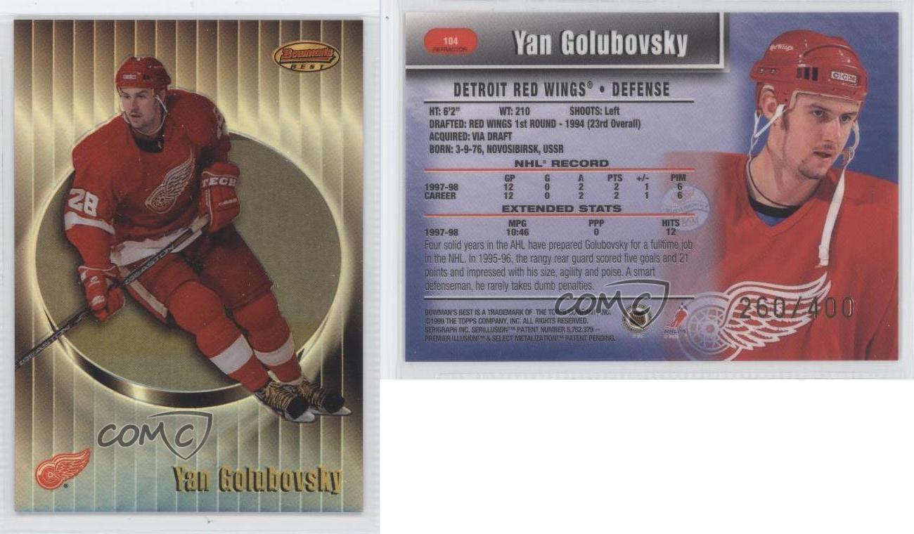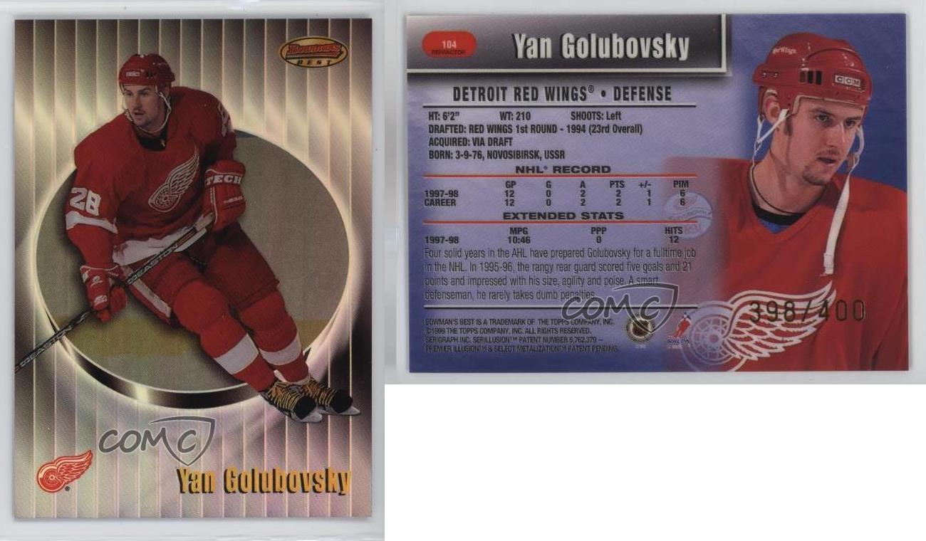 1998-99 Bowman's Best - [Base] - Refractor #104 Yan Golubovsky Qty Made: 400 - RC (Rookie Card) - Ice Hockey Card - Featuring the Detroit Red Wings - Featuring Yan Golubovsky Search for more: 1998-99 Bowman's Best Search for more: 1998-99 Bowman's Best - [Base] - Refractor View all of our Listings Auctions Buy It Now About Us Located in the beautiful Pacific Northwest, COMC (Check Out My Cards) is the world's largest consignment service for trading card singles. More than 10,000 people have used our consignment service to list over 50 million trading cards. Find out how we can help you consign your items on eBay by contacting us through eBay messaging. COMC -- "The Safe & Easy Way to Buy & Sell" Representative Image - Select Specific Item above to see image of actual item Representative Image - Select Specific Item above to see image of actual item Raw Condition for Modern Cards Unless otherwise noted, raw modern cards are listed in Near Mint-Mint condition or better. A NM-MT card appears to be Mint at first glance, but upon closer inspection, may exhibit some of the following: minor print defects (e.g. roller marks, print line, dimple), minor scratches, slight edge wear, and slight corner wear. Centering is clearly visible in the images provided and does not factor into our condition assessment. Raw Condition for Vintage Cards Unless otherwise noted, raw vintage cards are listed in Excellent condition or better. An EX card may exhibit some of the following: minor rounding of corners, surface wear, print defects, light scratches, and slight edge wear/chipping. Centering is clearly visible in the images provided and does not factor into our condition assessment. Domestic Shipping Combined shipping for multiple items is available. To receive combined shipping, please ensure all desired items are in your eBay shopping cart before proceeding to checkout. eBay limits orders to 40 items per order. We automatically combine multiple orders placed on the same day. If you place multiple orders on the same day, please contact us to request a refund of applicable shipping costs. Signature confirmation may be required on invoices over $400. All cards are protected and shipped securely. International Shipping COMC offers eBay's International Shipping (EIS) for international orders under $2,500* (see country exceptions below). All duties and import fees are paid at checkout; in the rare event that there are additional import fees upon delivery, these are borne by the buyer. EIS packages route through a shipping hub in Erlanger, KY before shipping to their final destination. Please note that EIS does not allow for combined shipments. The shipping rates are determined by eBay and cannot be adjusted. *Maximum sale price exceptions: Colombia, Kuwait ($2,000); Taiwan ($1,539); Chile, Costa Rica, Guatemala, Honduras, Trinidad and Tobago ($1,000); Antigua and Barbuda, Aruba, Belize, Dominica, Grenada, Philippines, Saint Kitts and Nevis, Saint Lucia, Montserrat, Turks and Caicos Islands ($500); Dominican Republic, El Salvador ($200). Please request a shipping quote through eBay messaging for orders that exceed the maximum sale price supported by eBay's International Shipping. You will be responsible for all duties and import fees for international orders shipped outside the EIS. All cards are protected and shipped securely. Payment COMC does not accept offers on our cards through our eBay storefront. COMC utilizes eBay’s managed payments system. If you are experiencing difficulties making a payment, please contact eBay for assistance. Return Policy Returns are only accepted on the rare occasion the item is not as described. If you are making a return, please initiate the return process through eBay so a mailing label can be provided for you. Prior to listing, our expert team carefully assessed this item to represent it accurately. Please review the description and high-definition images prior to purchasing to ensure this item meets your satisfaction. We welcome you to contact us if you have further questions about this item. Trust and Integrity COMC carefully assesses each item consigned to us to prevent fraudulent items from entering the marketplace. If you believe an item offered on COMC may be fraudulent, please contact us with details so we can investigate the issue. Items we determine are outside our supported items policy may be removed. Last Modified: 7/18/2025 12:38:55 AM PDT