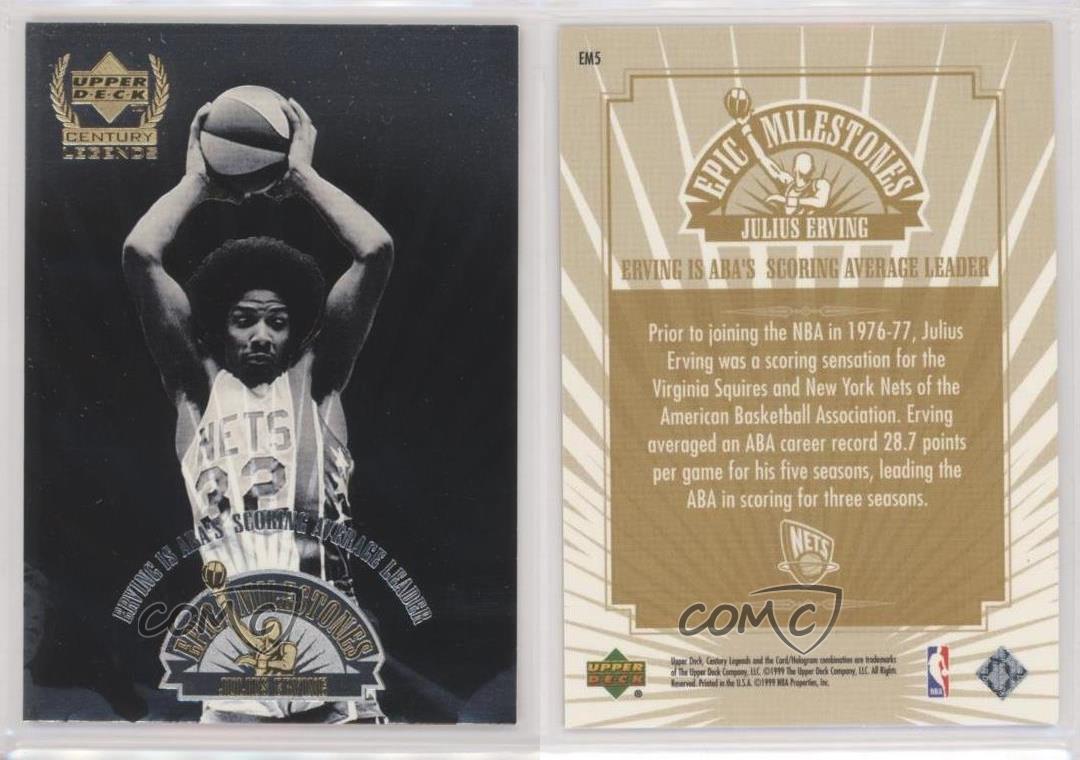 1998-99 Upper Deck Century Legends - Epic Milestones #EM5 Julius Erving - Basketball Card - Featuring the New Jersey Nets - Featuring Julius Erving Search for more: 1998-99 Upper Deck Century Legends Search for more: 1998-99 Upper Deck Century Legends - Epic Milestones View all of our Listings Auctions Buy It Now About Us Located in the beautiful Pacific Northwest, COMC (Check Out My Cards) is the world's largest consignment service for trading card singles. More than 10,000 people have used our consignment service to list over 50 million trading cards. Find out how we can help you consign your items on eBay by contacting us through eBay messaging. COMC -- "The Safe & Easy Way to Buy & Sell" Representative Image - Select Specific Item above to see image of actual item Representative Image - Select Specific Item above to see image of actual item Raw Condition for Modern Cards Unless otherwise noted, raw modern cards are listed in Near Mint-Mint condition or better. A NM-MT card appears to be Mint at first glance, but upon closer inspection, may exhibit some of the following: minor print defects (e.g. roller marks, print line, dimple), minor scratches, slight edge wear, and slight corner wear. Centering is clearly visible in the images provided and does not factor into our condition assessment. Raw Condition for Vintage Cards Unless otherwise noted, raw vintage cards are listed in Excellent condition or better. An EX card may exhibit some of the following: minor rounding of corners, surface wear, print defects, light scratches, and slight edge wear/chipping. Centering is clearly visible in the images provided and does not factor into our condition assessment. Domestic Shipping Combined shipping for multiple items is available. To receive combined shipping, please ensure all desired items are in your eBay shopping cart before proceeding to checkout. eBay limits orders to 40 items per order. We automatically combine multiple orders placed on the same day. If you place multiple orders on the same day, please contact us to request a refund of applicable shipping costs. Signature confirmation may be required on invoices over $400. All cards are protected and shipped securely. International Shipping COMC offers eBay's International Shipping (EIS) for international orders under $2,500* (see country exceptions below). All duties and import fees are paid at checkout; in the rare event that there are additional import fees upon delivery, these are borne by the buyer. EIS packages route through a shipping hub in Erlanger, KY before shipping to their final destination. Please note that EIS does not allow for combined shipments. The shipping rates are determined by eBay and cannot be adjusted. *Maximum sale price exceptions: Colombia, Kuwait ($2,000); Taiwan ($1,539); Chile, Costa Rica, Guatemala, Honduras, Trinidad and Tobago ($1,000); Antigua and Barbuda, Aruba, Belize, Dominica, Grenada, Philippines, Saint Kitts and Nevis, Saint Lucia, Montserrat, Turks and Caicos Islands ($500); Dominican Republic, El Salvador ($200). Please request a shipping quote through eBay messaging for orders that exceed the maximum sale price supported by eBay's International Shipping. You will be responsible for all duties and import fees for international orders shipped outside the EIS. All cards are protected and shipped securely. Payment COMC does not accept offers on our cards through our eBay storefront. COMC utilizes eBay’s managed payments system. If you are experiencing difficulties making a payment, please contact eBay for assistance. Return Policy Returns are only accepted on the rare occasion the item is not as described. If you are making a return, please initiate the return process through eBay so a mailing label can be provided for you. Prior to listing, our expert team carefully assessed this item to represent it accurately. Please review the description and high-definition images prior to purchasing to ensure this item meets your satisfaction. We welcome you to contact us if you have further questions about this item. Trust and Integrity COMC carefully assesses each item consigned to us to prevent fraudulent items from entering the marketplace. If you believe an item offered on COMC may be fraudulent, please contact us with details so we can investigate the issue. Items we determine are outside our supported items policy may be removed. Last Modified: 7/3/2025 9:17:23 PM PDT