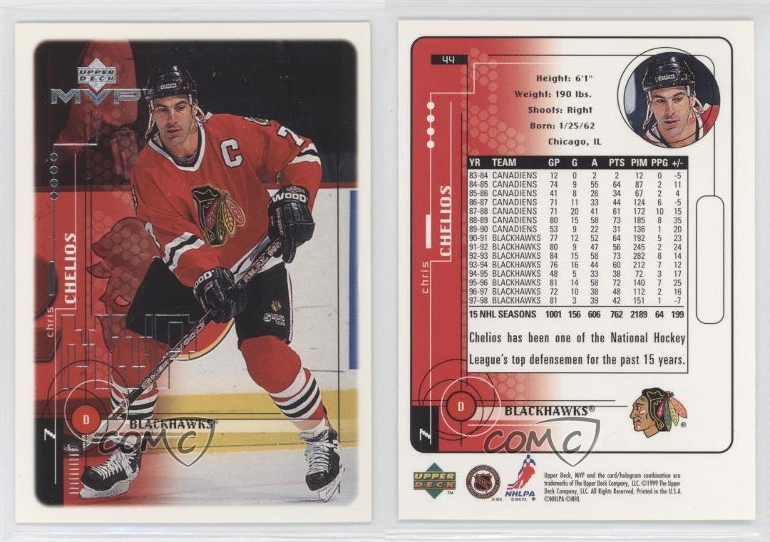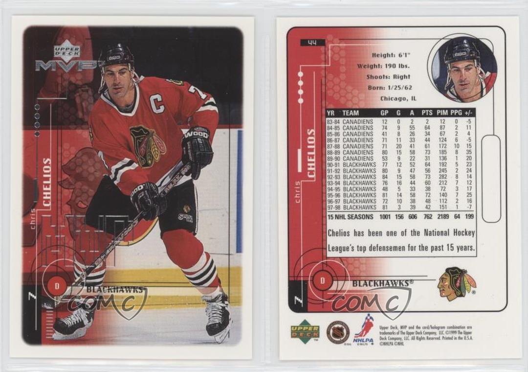 1998-99 Upper Deck MVP - [Base] #44 Chris Chelios - Ice Hockey Card - Featuring the Chicago Blackhawks - Featuring Chris Chelios Search for more: 1998-99 Upper Deck MVP Search for more: 1998-99 Upper Deck MVP - [Base] View all of our Listings Auctions Buy It Now About Us Located in the beautiful Pacific Northwest, COMC (Check Out My Cards) is the world's largest consignment service for trading card singles. More than 10,000 people have used our consignment service to list over 50 million trading cards. Find out how we can help you consign your items on eBay by contacting us through eBay messaging. COMC -- "The Safe & Easy Way to Buy & Sell" Representative Image - Select Specific Item above to see image of actual item Representative Image - Select Specific Item above to see image of actual item Raw Condition for Modern Cards Unless otherwise noted, raw modern cards are listed in Near Mint-Mint condition or better. A NM-MT card appears to be Mint at first glance, but upon closer inspection, may exhibit some of the following: minor print defects (e.g. roller marks, print line, dimple), minor scratches, slight edge wear, and slight corner wear. Centering is clearly visible in the images provided and does not factor into our condition assessment. Raw Condition for Vintage Cards Unless otherwise noted, raw vintage cards are listed in Excellent condition or better. An EX card may exhibit some of the following: minor rounding of corners, surface wear, print defects, light scratches, and slight edge wear/chipping. Centering is clearly visible in the images provided and does not factor into our condition assessment. Domestic Shipping Combined shipping for multiple items is available. To receive combined shipping, please ensure all desired items are in your eBay shopping cart before proceeding to checkout. eBay limits orders to 40 items per order. We automatically combine multiple orders placed on the same day. If you place multiple orders on the same day, please contact us to request a refund of applicable shipping costs. Signature confirmation may be required on invoices over $400. All cards are protected and shipped securely. International Shipping COMC offers eBay's International Shipping (EIS) for international orders under $2,500* (see country exceptions below). All duties and import fees are paid at checkout; in the rare event that there are additional import fees upon delivery, these are borne by the buyer. EIS packages route through a shipping hub in Erlanger, KY before shipping to their final destination. Please note that EIS does not allow for combined shipments. The shipping rates are determined by eBay and cannot be adjusted. *Maximum sale price exceptions: Colombia, Kuwait ($2,000); Taiwan ($1,539); Chile, Costa Rica, Guatemala, Honduras, Trinidad and Tobago ($1,000); Antigua and Barbuda, Aruba, Belize, Dominica, Grenada, Philippines, Saint Kitts and Nevis, Saint Lucia, Montserrat, Turks and Caicos Islands ($500); Dominican Republic, El Salvador ($200). Please request a shipping quote through eBay messaging for orders that exceed the maximum sale price supported by eBay's International Shipping. You will be responsible for all duties and import fees for international orders shipped outside the EIS. All cards are protected and shipped securely. Payment COMC does not accept offers on our cards through our eBay storefront. COMC utilizes eBay’s managed payments system. If you are experiencing difficulties making a payment, please contact eBay for assistance. Return Policy Returns are only accepted on the rare occasion the item is not as described. If you are making a return, please initiate the return process through eBay so a mailing label can be provided for you. Prior to listing, our expert team carefully assessed this item to represent it accurately. Please review the description and high-definition images prior to purchasing to ensure this item meets your satisfaction. We welcome you to contact us if you have further questions about this item. Trust and Integrity COMC carefully assesses each item consigned to us to prevent fraudulent items from entering the marketplace. If you believe an item offered on COMC may be fraudulent, please contact us with details so we can investigate the issue. Items we determine are outside our supported items policy may be removed. Last Modified: 7/12/2025 9:47:28 PM PDT