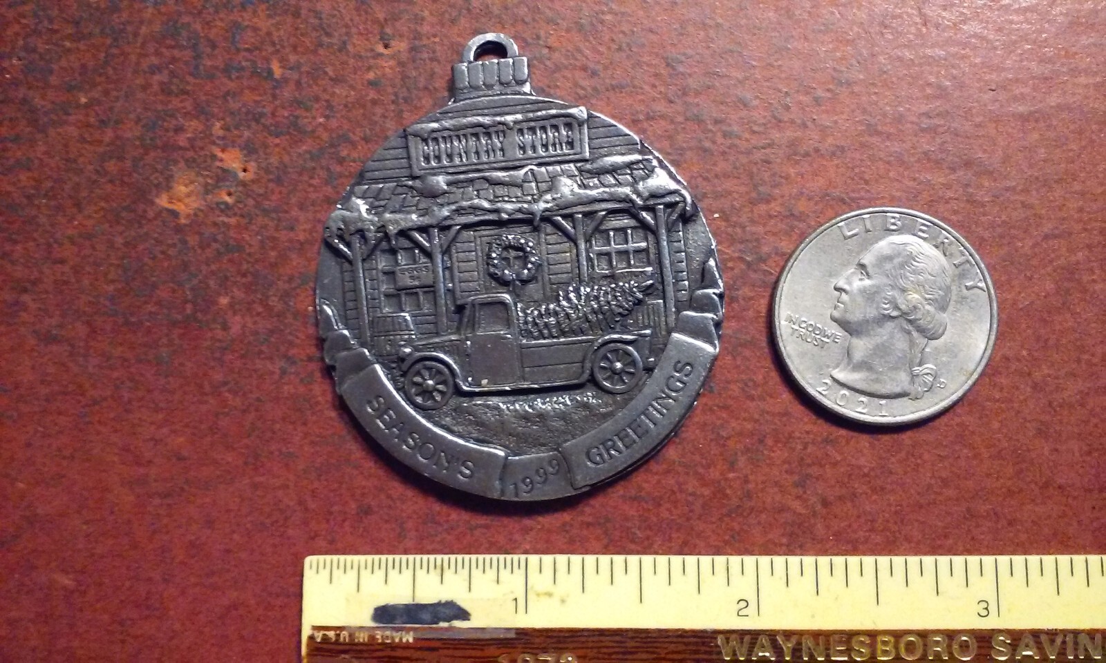 1999 Season's Greetings Round Pendant Ornament Hanging COUNTRY STORE Pick-Up Truck. Measures 1-3/4" Inches Diameter. Also it is Non-Magnetic, so may be made of Nickel or Alloy. Neat 3-D Like Raised Image of Old Country Store and Pick-Up Truck.