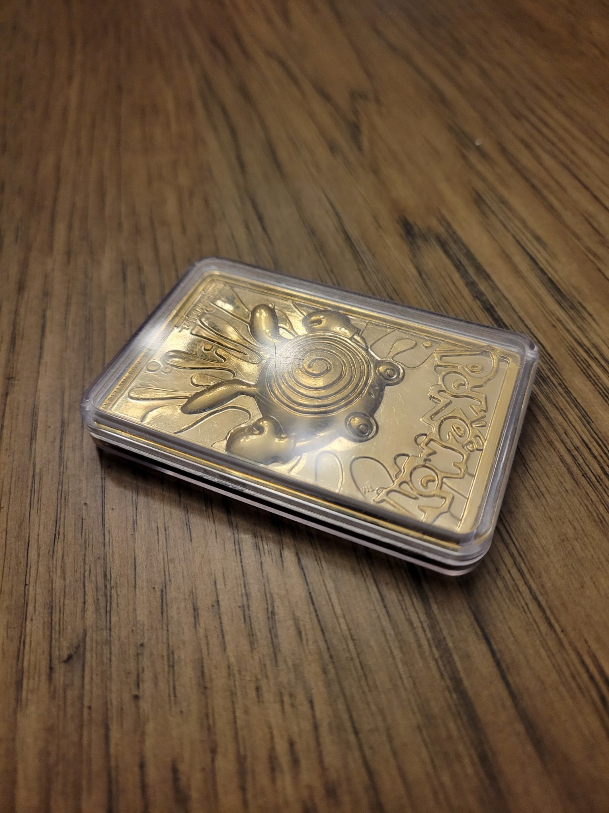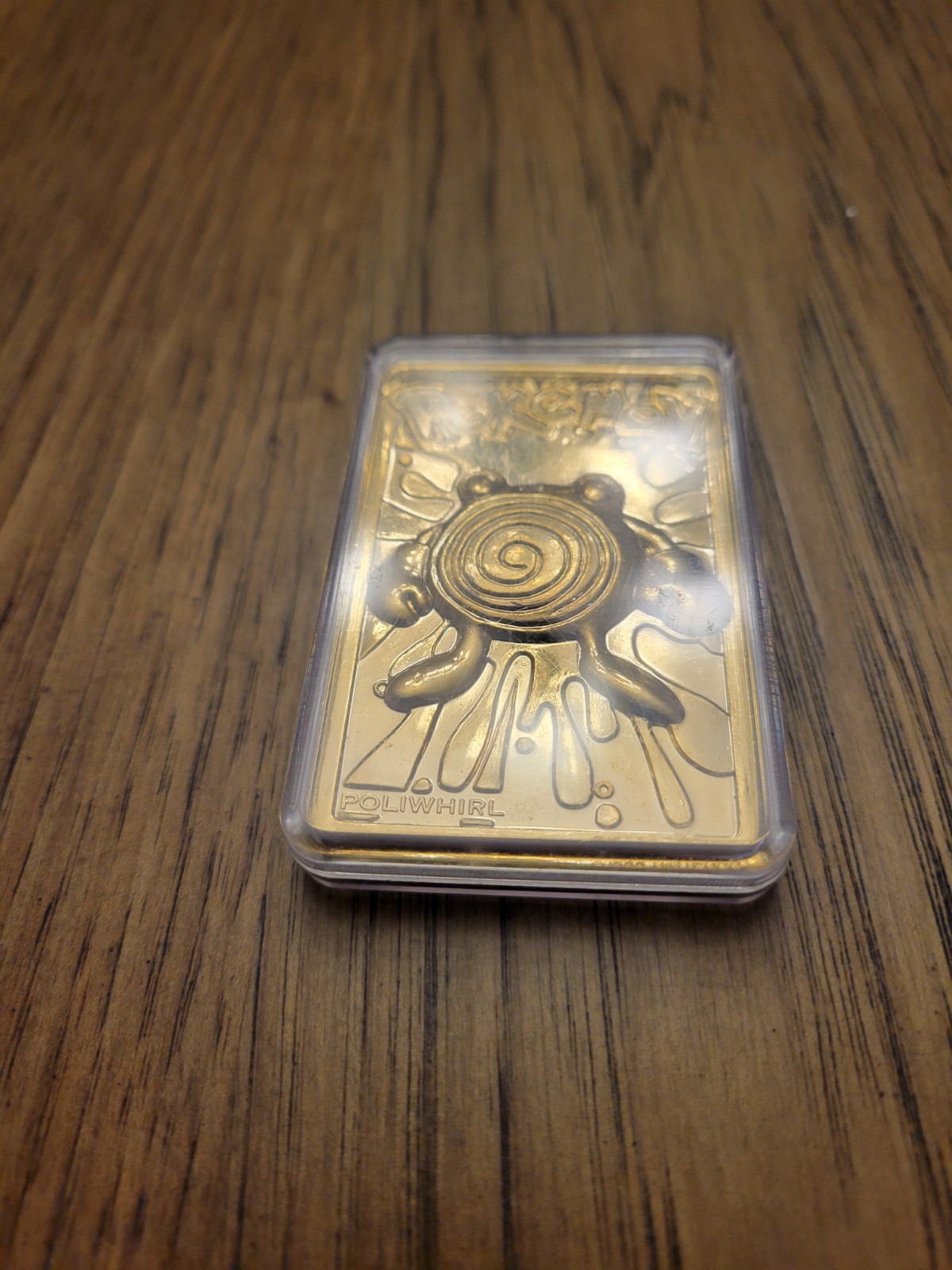 Pokemon POLIWHIRL Gold Plated Trading Card 1999 Nintendo With Case Card has been in it's case basically it's entire existence but does show a few signs of wear. I got this when they were released and have had this in my collection since. Notable wear includes a couple chips in the rear bottom border of card to the right of CHINA as well as worn sections on Poliwhirl's feet also on rear of card. Face of card has a few faint scratches and there are a couple pin sized chips above Poliwhirl on front face of card. Plastic case has a scratch on the back and a few light surface scratches. Feel free to reach out with further questions.