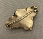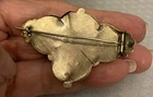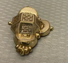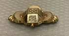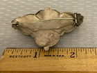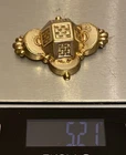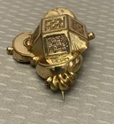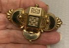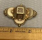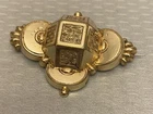 Stunning 19th century gold top hollow brooch with a very relief 3D geometric design. It has a raised cube with weave pattern on all sides in the center. There are sculpted scallops and bead shapes around the sides. Measures 2-1/8" wide x 1-1/2" high and has a profile of 1/2". The back is goldfilled and all original with hinge at long pin shaft and curly C hook pin clasp. Although this brooch is a good size and looks substantial, it only weighs 5.21 grams because it is very thin and hollow. The top is excellent, no damage or problems. The back side has some small scratches and looks slightly pushed in, you can see the age although nothing that is significant, and this pin is entirely original nearly 200 years old with no repairs. A fine addition to any collection, and still extremely wearable.