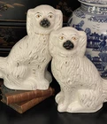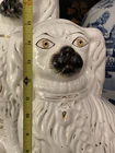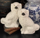 Stunning Impressive Very Rare Surviving Pair Massive White Antique Classic English Porcelain Staffordshire Mantle Hearth Fireside Dogs • Magnificent 19th Century Decorative Arts Objects • Purchased England • Height 15” This is an extremely rare surviving gallery quality pair of 19C antique white English Staffordshire mantle hearth dogs with warm hand detailing to faces, accessories and markings in classic period technique. Featuring characteristic formal expressions, yet each one with its own warm personality, this pair is exquisite in its beauty, girth and condition. In lovely rarely seen great scale and elegant form with beautiful moulding to coat and tail, this pair of stately right and left facing figures is a superb period example that will bring a grand touch of English aesthetic to any setting in which it is placed. Timeless and versatile, this dramatic period statement piece may be arranged front and center on its own as a focal point on a mantlepiece or flanking fireside around the hearth. Pair alternatively atop a sidepiece or table to create a stunning focal point that will add depth and appeal to any room. Excellent period condition. Expected historic time softened patina. Superb. Museum quality surviving example. Minimal expected age related post-production wear. Words don’t do justice to this glorious pair. Very few of these massive models exist as they rarely survive the generations. A one of a kind treasure to own forever. HUGE. Display ready. * Listing is for pair of large mantle hearth dogs only. Additional pieces are for display purposes. Height 15”