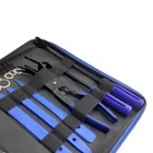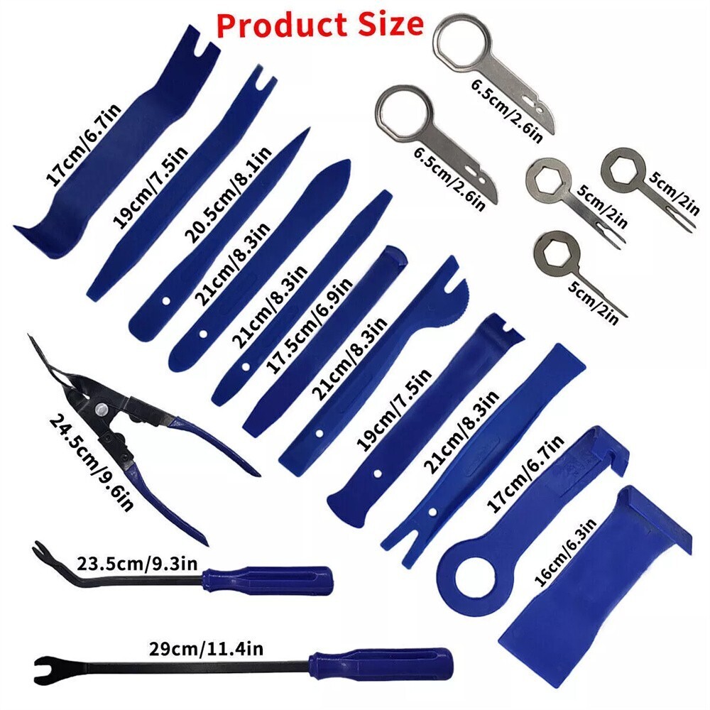 Product Description: Multi-use Purposes - 19pcs specially designed trimming tools, excellent forautomotive, marine, furniture or aircraft trim removal and installation, including door panels, moldings, window trims, clips, fasteners, emblems, panels, radios, ect. Meets All Needs - The profectional tools can fit all types of car modifications. And its ergonomic design and lightweight help you efficiently handle various interior and exterior car trimming with ease Premium Quality Material- Made of durable and impact resistant nylon fiber, won't break like the ABS ones. It is eco-friendly, non-toxic and breakage-proof, abrasion and corrosion resistant for long lasting durability. Harmless to Car- The moderate curve design is anti-scratches and harmless to car paint. Easy Storage and Higly Portable- Come with nice zipper storage pouch. each tool can be stored properly so that you don?t misplace or lose them. The special hand strap desgin can free your hands for other works and improve its portability. Multi-Function Tools: 1.Trim Removal Tools 2.Clip Removal Pliers 3.Precision Hook Pick 4.Stereo Removal Tools 5.U-shaped Removal Tool 6.Car Terminal Removal Tools 7.Upholstery Fastener Removers Product Specifications: Color: Blue Material: Polypropylene material Size: 320 * 233 * 50 Suitable for 1: Car radio/radio, door trim, installation clips Suitable for 2: Dome lights, windows, audio CD control area, and interior Packaging included: 11 x interior disassembly tool 2 release tools 4 stereo disassembly tools 1 ceiling light clanking sound 1 portable zippered storage bag
