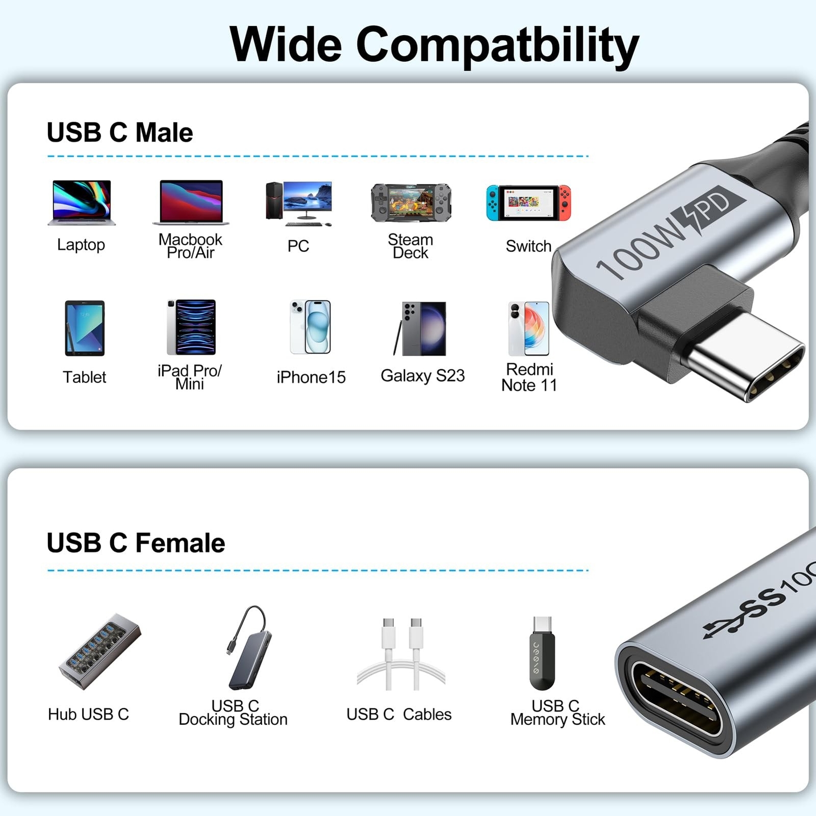 Small USB C Extension Cable 1FT, Short Type C Extender Right Angle Cord, USB 3.2 (10Gbps) Male to Female 100W PD Charging for MacBook Pro/Air,USBC Hub,Microphone,Flash Drive,Docking Station,Phone,PC Product Details Size: 1FT Color: Grey Number of Items: 1 Brand: URELEGAN MPN: URE-1310-001 UPC: Does not apply EAN: Does not apply Brand: URELEGAN Connector Type: USB Type C Cable Type: USB Type-C Compatible Devices: iPhone 15, Pixel 8 7/6a/6/5/4/3/2/XL, Galaxy Tab S8/ S8+/ S8 Ultra, Galaxy S22/22+/22 Ultra, Switch, iPad, Surface Go, iMac Pro, MacBook Mini, MacBook Pro 2020 2021, Google Chromebook Pixel, Dell XPS 13/ 15, Mag-safe Wireless Charger and more USB C peripherals devices. See more Special Feature: High Speed, Braided, Heat Resistant Package Dimensions : 9.37 x 6.22 x 0.35 inches; 0.81 ounces Item model number : URE-1310-001 Date First Available : December 6, 2023 Manufacturer : URELEGAN Country of Origin : China Best Sellers Rank: #4,813 in USB Cables Customer Reviews: 4.4 4.4 out of 5 stars 414 ratings USB C Extension Right Angle Design90-Degree design protect the plug and extend the life of cable by reducing the strains of everyday use. makes for better cable management in tight spaces like cars, corners, play game, etc. USB C extension cable solves the problem of being unable to use due to charging or data transmission being too short. Wide CompatibilityThis USB3.1 Extension Cable compatibility with MacBook Pro 13/15/16 inch,MacBook Air 13/13.3 inch,MacBook 12 inch,S9-S24 and other USB-C Hub/Laptop/Tablet/Phone/Camera/Drone Remote/Headphones/Switch/Flash Drive/Tablet/Phone/Computer/Monitor.(Note: This cable not work with any thunderbolt 3 docking/hub/cable, Quest Link) 100W Fast Charging and SyncThis Type c extension cable works perfectly for max 5A fast charging and 10Gbps data transmission. Moreover, pure copper wire make sure its High-Speed charging and stable data sync; and supports video resolutions up to 4K (3840 * 2160, 60Hz), Allowing you to enjoy high quality screen resolution in large monitor, both home office and gaming. Ultra DurableAluminum shell and Premium nylon braided cable adds additional durability and tangle free. Double side can be in, easy to use; and updated connector design with multiple layers of shielding to minimize interference, corrosion resistant, effectively extend the life of the cable.