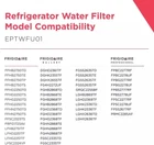Please note: this filter is EPTWFU01 , NOT FPPTWFU01 Make safe water second nature: Certified to reduce contaminants and keep great tasting water flowing for you and your family Filters out up to 99% of contaminants. Push and twist easy install: Always review your use and care guide before installation, to install slide new filter in with grip oriented horizontally. Push firmly and turn 90° to the right until it snaps into place NSF 42, 53 and 401 certified to filter out contaminants: Tested and certified by NSF International against NSF/ANSI standards 42, 53 and 401 in PureSource Ultra II – U and PureSource Ultra II – M for reduction of claims on the performance data sheet Features High quality, affordable activated carbon filter replacement for: Frigidaire Filter Model/Part Numbers: EPTWFU01, EPTWFU01C, EWF02 4562222 012505454226 Compatible with refrigerator model numbers: FPBC2277RF, FPBC2277RF0, FPBC2277RF1, FPBC2277RF2, FPBC2277RF3, FPBC2277RF5, FPBG2277RF, FPBG2277RF0, FPBS2777RF, FPBS2777RF0, FPBS2777RF1, FPBS2777RF2, FPBS2777RF3, FPBS2777RF4, FPBS2777RF9, FPSC2277RF0, FPSS2677RF0 Will fit and lock in all compatible refrigerators. Will not leak! Guaranteed or 100% money back. Long lasting up to six months or 300 gallons. Tested and certified by Iapmo R&T to NSF/ANSI Standard 42. Details Package Dimensions: 9.1 x 2 x 2 inches Item Weight: 7.7 ounces Shipping Weight: 7.7 ounces Manufacturer: Clearwater Filters Installation Instruction: 1.Shut off water source 2.Remove the existing filter by turning it left,and then take it out 3.Remove the cap of a new filter,insert it into refrigerator and turn right to lock it in place 4.Recover the water source,and check it there is leakage 5.Run the working press for 4 minutes(about 8 cups of water )for purge6 reset replacement indicator light by pressing the ICE TYPE button and the CHILD LOCK(or MOISTURE CONTROL)button simultaneously for 3 seconds