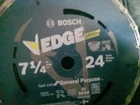 The Bosch Edge Circular Saw Blade features a 7-1/4" blade diameter with 24 teeth, ideal for framing tasks. The blade is designed with edge extreme carbide for durability. This single pack unit is suitable for circular saws, with a blue/grey color scheme. The model number is DCB724.