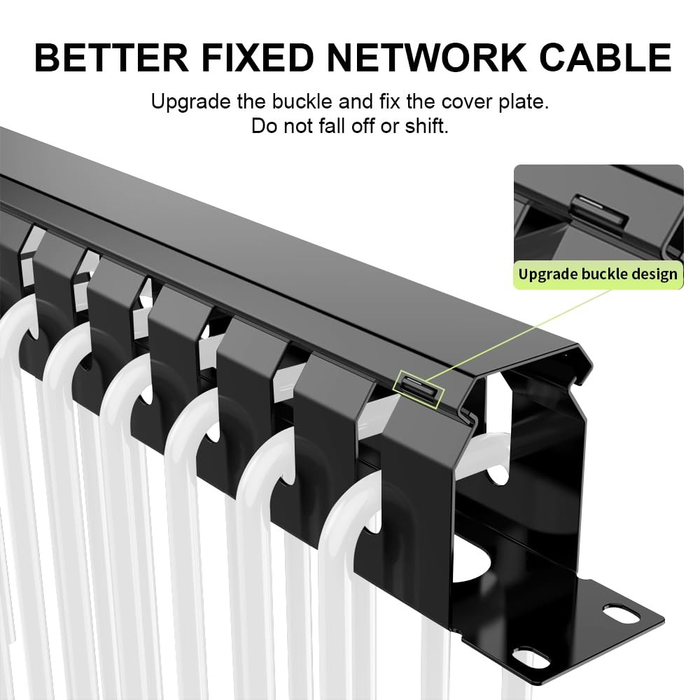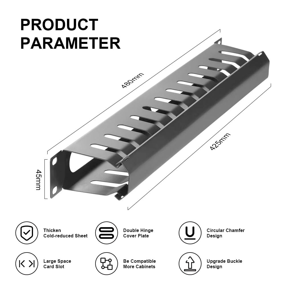 Product Size: 19" x 2.75 " x 1.75 " (1U) For Standard 19” Rack. No plastic - Steel panel,Steel cover 12 Larger Slot Cable Manager Duct with Cover Not Paying the Air, but Easy to Assemble 12 Large Slots Round Design Apply to 19" Standard Network Cabinet