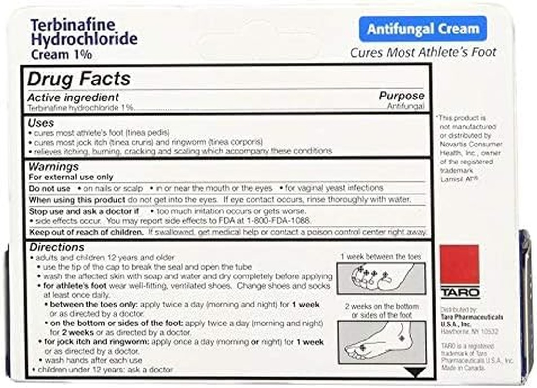 Store New Arrivals Add to Favorite View Feedback Terbinafine Hydrochloride 1% for 1 Week Athlete’S Foot Treatment Antifungal Cream Fast Symptom Relief & Prevents Recurrence 1 Oz. (30 G) Pack of 2 Description Item model number B0CRWPTQM6 Number of Items 2 Item Volume 1 Fluid Ounces Brand TARO Active Ingredients Terbinafine Age Range (Description) Adult Package Dimensions 8.39 x 5.12 x 1.5 inches; 4.16 ounces Manufacturer Taro BEATS ATHLETE'S FOOT IN JUST ONE WEEK: Our powerful Athlete’s Foot cream provides fast symptom relief and eliminates the fungus with just one week of daily use. It also helps prevent recurrence for up to 3 months. PRESCRIPTION STRENGTH FORMULA: Crafted with prescription-strength Terbinafine Hydrochloride 1%, this formula specifically targets and eradicates the fungus, helping you quickly overcome athlete's foot. Unlike many over-the-counter options, our cream delivers faster and more effective results, ensuring you can move on from athlete's foot in just one week. FAST SYMPTOM RELIEF WITH LONG-LASTING EFFECTS: Terbinafine provides fast and effective relief from athlete’s foot symptoms, including itching, burning, cracking, redness, and blistering. Unlike many over-the-counter options, Ohm terbinafine not only alleviates discomfort quickly but also kills the fungus that causes foot odor. Its long-lasting effects help prevent recurrence, ensuring your feet stay healthy and symptom-free for an extended period. Product Description ABOUT US We offer the best prices around on high quality products. Our E-store includes media such as books, movies, music and games while offering electronics, toys, sporting apparel, clothing, tools, general home, garden items and more. SHIPPING We are always working hard to ensure your package arrives as soon as possible. Please understand that some factors like weather, high postal traffic, and the performance of shipping companies are outside of our control. We offer free shipping to the lower 48 states and ship within 2 business days of payment, usually sooner. We do not accept P.O. Boxes. Please provide a physical address. RETURNS We offer a 30-Day Return Policy on items which you are not completely satisfied with. You have the option for a full-refund or an exchange of the item. No returns are available on items shipped outside of the USA. PAYMENT We accept PayPal. CONTACT US This page content is yet to come Please ad us to your favorite seller and visit again later Thank You