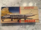The product is a 1st edition 1959 Airfix model kit number 381, featuring the DE HAVILLAND HERON JERSEY AIR airplane in 1:72 scale. It is an unassembled kit that comes complete in its original box. This vintage kit is from Jersey and is part of the Aerial theme. The kit is not painted and was manufactured in 1959. It is a detailed representation of the DE HAVILLAND HERON JERSEY AIR airplane, perfect for model enthusiasts and collectors. Kit has been inventoried complete 67 parts plus stand, instructions, 2 sets of decals and a Jersey Airlines brochure.