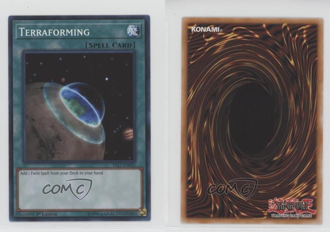 2017 Yu-Gi-Oh! Starter Deck: Link Strike - [Base] - 1st Edition #YS17-EN031 Terraforming COMC Item: 104302917 - YuGiOh Card - Featuring Terraforming Search for more: 2017 Yu-Gi-Oh! Starter Deck: Link Strike Search for more: 2017 Yu-Gi-Oh! Starter Deck: Link Strike - [Base] - 1st Edition View all of our Listings Auctions Buy It Now About Us Located in the beautiful Pacific Northwest, COMC (Check Out My Cards) is the world's largest consignment service for trading card singles. More than 10,000 people have used our consignment service to list over 50 million trading cards. Find out how we can help you consign your items on eBay by contacting us through eBay messaging. COMC -- "The Safe & Easy Way to Buy & Sell" Raw Condition for Modern Cards Unless otherwise noted, raw modern cards are listed in Near Mint-Mint condition or better. A NM-MT card appears to be Mint at first glance, but upon closer inspection, may exhibit some of the following: minor print defects (e.g. roller marks, print line, dimple), minor scratches, slight edge wear, and slight corner wear. Centering is clearly visible in the images provided and does not factor into our condition assessment. Raw Condition for Vintage Cards Unless otherwise noted, raw vintage cards are listed in Excellent condition or better. An EX card may exhibit some of the following: minor rounding of corners, surface wear, print defects, light scratches, and slight edge wear/chipping. Centering is clearly visible in the images provided and does not factor into our condition assessment. Domestic Shipping Combined shipping for multiple items is available. To receive combined shipping, please ensure all desired items are in your eBay shopping cart before proceeding to checkout. eBay limits orders to 40 items per order. We automatically combine multiple orders placed on the same day. If you place multiple orders on the same day, please contact us to request a refund of applicable shipping costs. Signature confirmation may be required on invoices over $400. All cards are protected and shipped securely. International Shipping COMC offers eBay's International Shipping (EIS) for international orders under $2,500* (see country exceptions below). All duties and import fees are paid at checkout; in the rare event that there are additional import fees upon delivery, these are borne by the buyer. EIS packages route through a shipping hub in Erlanger, KY before shipping to their final destination. Please note that EIS does not allow for combined shipments. The shipping rates are determined by eBay and cannot be adjusted. *Maximum sale price exceptions: Colombia, Kuwait ($2,000); Taiwan ($1,539); Chile, Costa Rica, Guatemala, Honduras, Trinidad and Tobago ($1,000); Antigua and Barbuda, Aruba, Belize, Dominica, Grenada, Philippines, Saint Kitts and Nevis, Saint Lucia, Montserrat, Turks and Caicos Islands ($500); Dominican Republic, El Salvador ($200). Please request a shipping quote through eBay messaging for orders that exceed the maximum sale price supported by eBay's International Shipping. You will be responsible for all duties and import fees for international orders shipped outside the EIS. All cards are protected and shipped securely. Payment COMC does not accept offers on our cards through our eBay storefront. COMC utilizes eBay’s managed payments system. If you are experiencing difficulties making a payment, please contact eBay for assistance. Return Policy Returns are only accepted on the rare occasion the item is not as described. If you are making a return, please initiate the return process through eBay so a mailing label can be provided for you. Prior to listing, our expert team carefully assessed this item to represent it accurately. Please review the description and high-definition images prior to purchasing to ensure this item meets your satisfaction. We welcome you to contact us if you have further questions about this item. Trust and Integrity COMC carefully assesses each item consigned to us to prevent fraudulent items from entering the marketplace. If you believe an item offered on COMC may be fraudulent, please contact us with details so we can investigate the issue. Items we determine are outside our supported items policy may be removed. Last Modified: 6/8/2025 6:00:51 AM PDT
