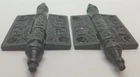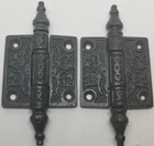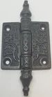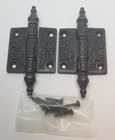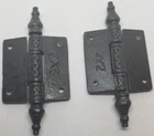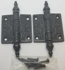 Victorian Style Iron Screen Door Hinges Your choice of 2" or 2.5" Classic Victorian pattern. Heavy cast iron with a vintage lacquer coating finish to prevent rusting. Removable pin. Small Hinge Overall: 2.5" tall by 4" wide (including center post) (tip to tip points are 4" Large Hinge Overall: 2.5" tall by 5" wide (including center post) (tip to tip points are 4.5" Sold By The Pair Only -- Two Hinges and 8 Black Screws. FK-088450 088451 (F-9973)