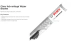 Bosch "Clear Advantage" Wiper Blade set of 2 (Pair) 22" / 22" This 2 piece set includes : 1x Driver side wiper blade 1x Passenger side wiper blade Bosch Clear Advantage wiper features : Patented beam design reduces exposed metal, resisting ice and snow build-up for all-weather performance Conforms to your windshield better than traditional wipers Graphite-treated wiping edge reduces friction for a quiet and smooth wipe in all seasons Sleek, Aerodynamic Styling Instructions included. Easy one-step installation with the "Click-On" adapter system. Genuine Bosch. Brand New in factory sealed package. Compatibility : (enter your vehicle's Year, Make & Model in the part finder above to ensure fit) See list above Payments & Shipping : We accept all forms of payment through Paypal (Credit card, debit card, Paypal) Ships fast; same day or within 1 business day of payment Bosch is a worldwide leader in high performance and durable wiper blades meeting and exceeding OEM (Original Equipment Manufacturer) specifications