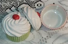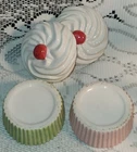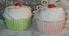 2 Cupcake shaped trinket boxes with white frosting, cherries on top, and painted green and pink wrappers with removable lids. Perfect for small jewelry or keepsakes. Have been pre-loved, but no chips or damage besides scuffs on the bottoms from use on the dresser top. See photos for details.
