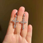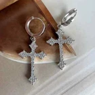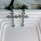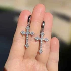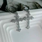 This 2 Ct Round Simulated Diamond Women Cross Hoop & Drop Earring is crafted in sterling silver with a 14k white gold overlay. The earrings feature a cross shape with huggie and dangle/drop style, adorned with simulated diamonds in a prong setting. Measuring 18mm in length and 10mm in diameter, these earrings are nickel-free and engraved, making them suitable for various occasions like engagements, birthdays, and Valentine's Day. They are handmade and can be personalized according to the buyer's requirements, offering a unique touch to the accessory.