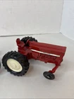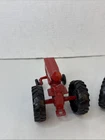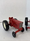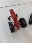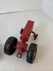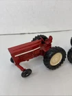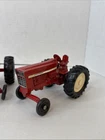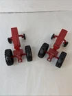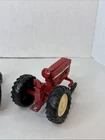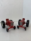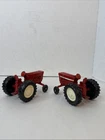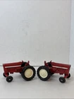 This is a set of two Ertl vintage toy farm tractors in diecast metal. The tractors are modeled after International Harvester vehicles and are small in scale. They are designed in a classic red color and made of pressed steel, making them durable and collectible items for toy and vintage vehicle enthusiasts. Will have marks and signs of wear from use over time