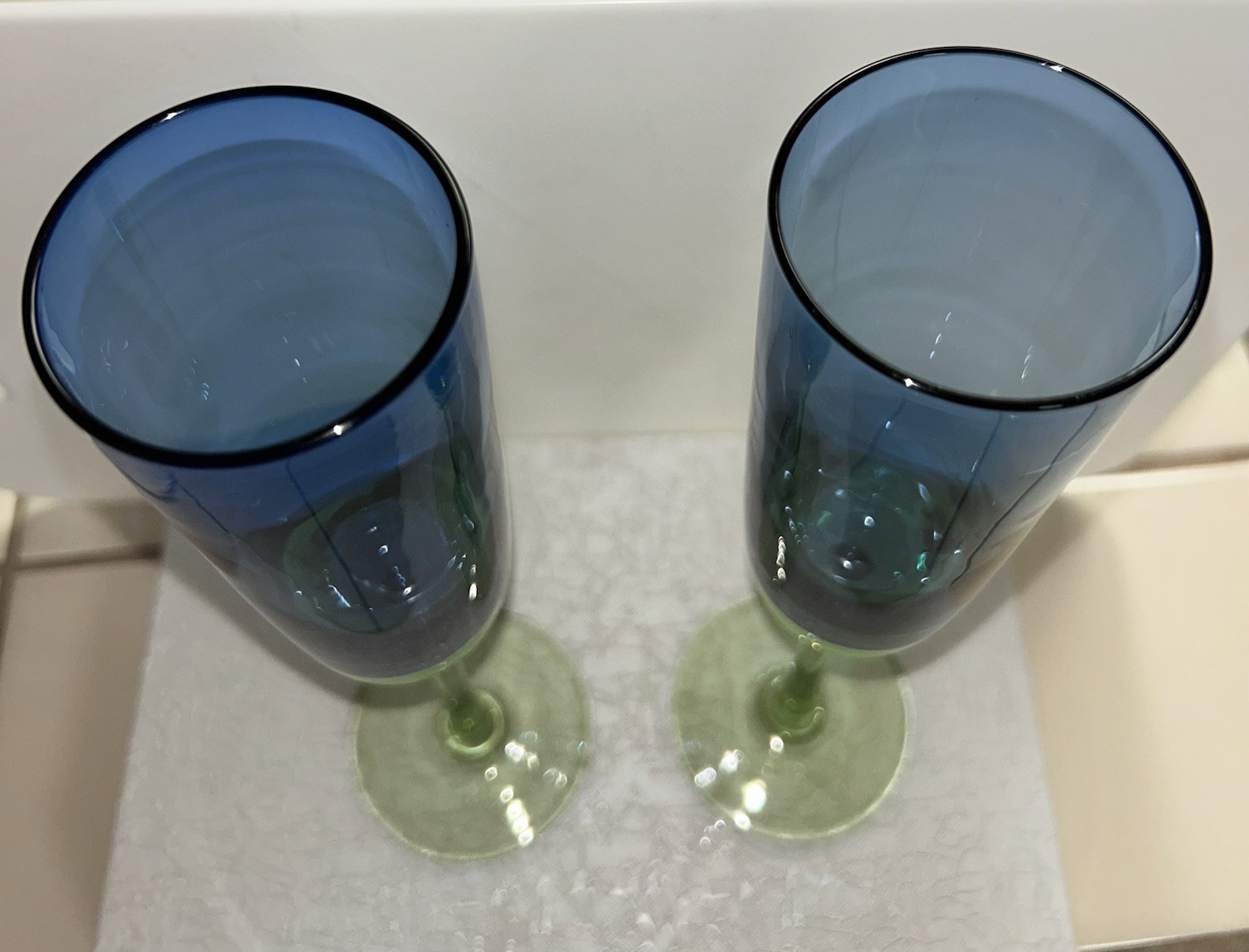 2 Festival Blue Green Champagne Flutes Glasses Block Metropolis Blown Glass Mint
