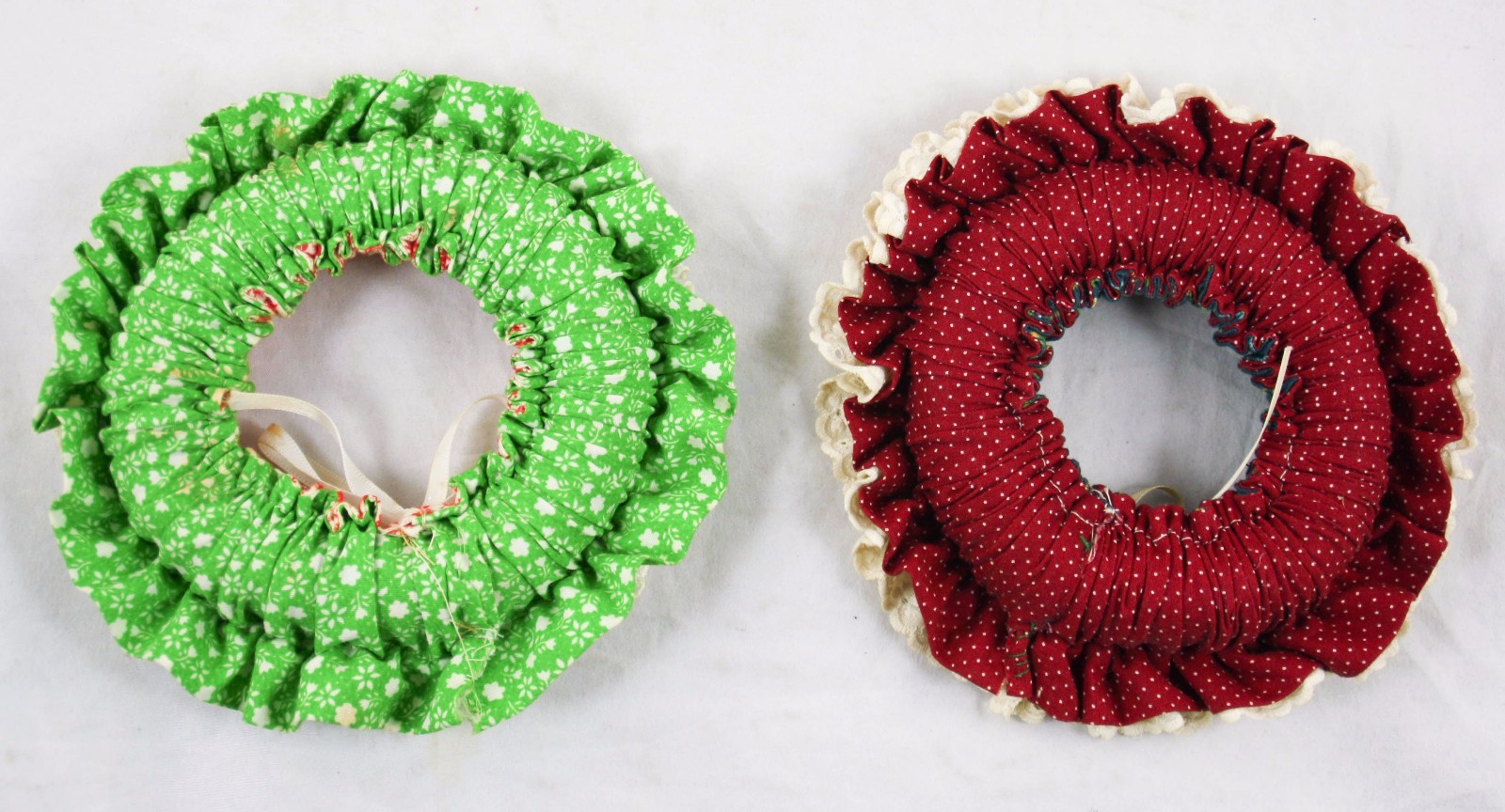 Christmas Ornament 2 Fabric Wreaths Measures approximately 6.5" x 6.5" Please see pictures for details and condition. Condition is subjective and items are sold as is but I would be happy to answer questions or provide more pictures if needed. Also please let me know if you are not satisfied with your purchase for any reason before opening a case. I will work hard to make sure you are satisfied and you can always start a case if you are not happy with my response. I have a pretty relaxed return policy so if you don't like something I am happy to take it back. As always, if you have information that could help me improve my listing please share the knowledge and let me know. Thank you Check out my other items !