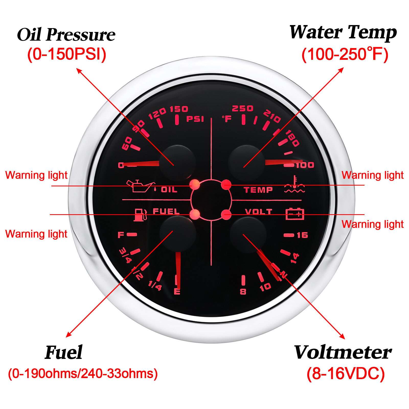 2 Gauge Set 85mm GPS Speedometer 0-200MPH & 4IN 1 Fuel/Water Temp/Oil Press/Volt 2 Gauge Set with Senders 85mm GPS Speedometer 0-200MPH with 85mm Fuel Level Water Temp Oil Pressure Volt For Car Boat Features: Suitable for all vehicles and off-road vehicles The signal comes directly from the satellite signal receiver(GPS Antenna), don't need other speed sensor. The gauge has the advantages of high precision, quick location confirmation and short start up time. IP67 waterproof and dustproof grade Reverse polarity protection and anti-fogging performance Stepper motors used for full range of stepping gauges, great feature with its less power consumption, longer life, higher precision, etc. Most importantly, the gauge is easy to setup, and can be used in all vehicles, boats and off-road vehicles. Speedometer Specifications: Application: Universal fit for Motorcycle/ Boat/Truck/Bus/Car Electronic Speedometer (stepper motor) No Mechanic Sensor, get speed signal from GPS Speed ≠0 and show accurate speed in tunnel with the help of accelerometer Total Mileage Adjustable GPS Blind Area Odometer Compensation OverSpeed Buzzer Alarm (Value Adjustable) Indication Light (Left, Right and High Beam Installation Diameter: 85mm (3 3/8") Speed Range: 0~200MPH RPM Range : 0~8000RPM Mileage Range: 0-99999.9miles Working Voltage: 12V/24V Working temperatures: - 40 to 85°C Protection rank: IP67 Waterproof Reverse polarity protection and anti-fogging performance 4 IN 1 Gauge Technical Data: Fixing dimension: 85mm Indicating Range: Oil press. meter: 0-150PSI Water temp. meter: 100-250℉ Fuel level meter: 0-190ohms/240-33ohms, empty-full; The signal can be adjusted Voltmeter: 8-16V Working Voltage: 12V Input Signal: 10-184ohms for 0-150PSIoil pressure meter; 0-190ohms for fuel level meter;(Default 0-190ohms, can adjust to 240-33ohms) 8-16V voltage meter; Input Signal 320-22ohms for water temperature meter Red backlight Protection grade is IP67, the whole body is completely waterproof; Excellent antifogging function; 316 Stainless steel bezel with curved glass; Convenient Installation by multi-plug socket connecting way; Accessories: matched with connectors, Installation Instruction Package Included: 1 x 85mm 4 in 1 Multifunctional Gauge 1 x 85mm GPS Speedometer Gauge 1 x GPS Antenna 1 x M16*1.5 Tacho Sensor 1 x 1/8NPT Oil pressure Sensor 1 x 1/8NPT Water Temp Sensor 2 x Cable 2 x Installation Instruction